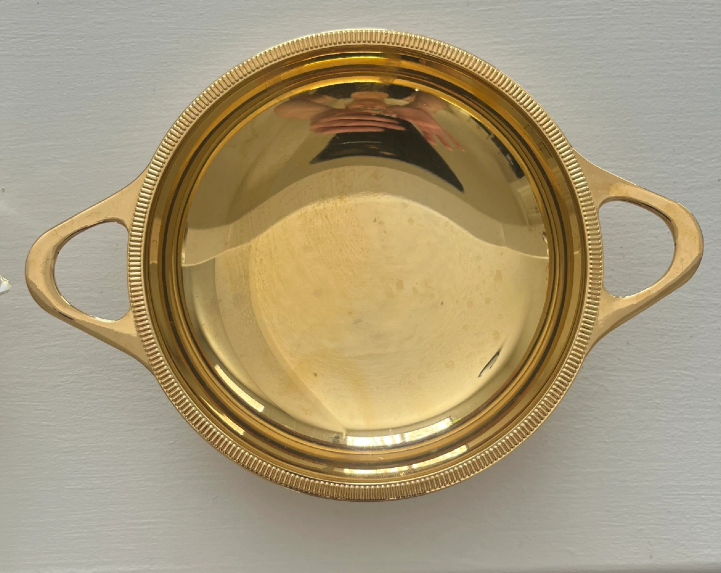 A golden bowl with two handles, identified as a BMF. It's a traditional utensil from India often made of brass.