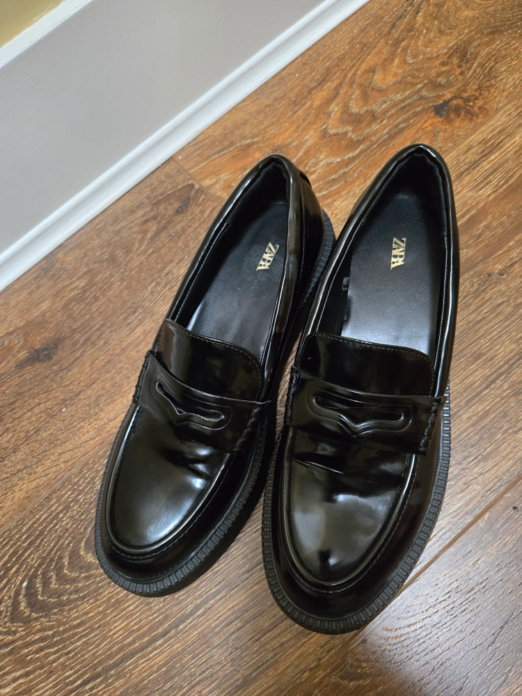 Women's black patent leather loafers. Chunky platform sole. Slip-on style. Good condition.
