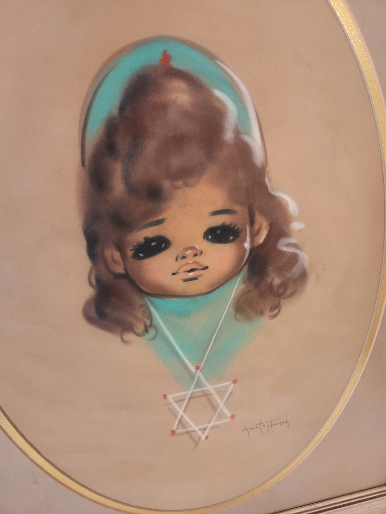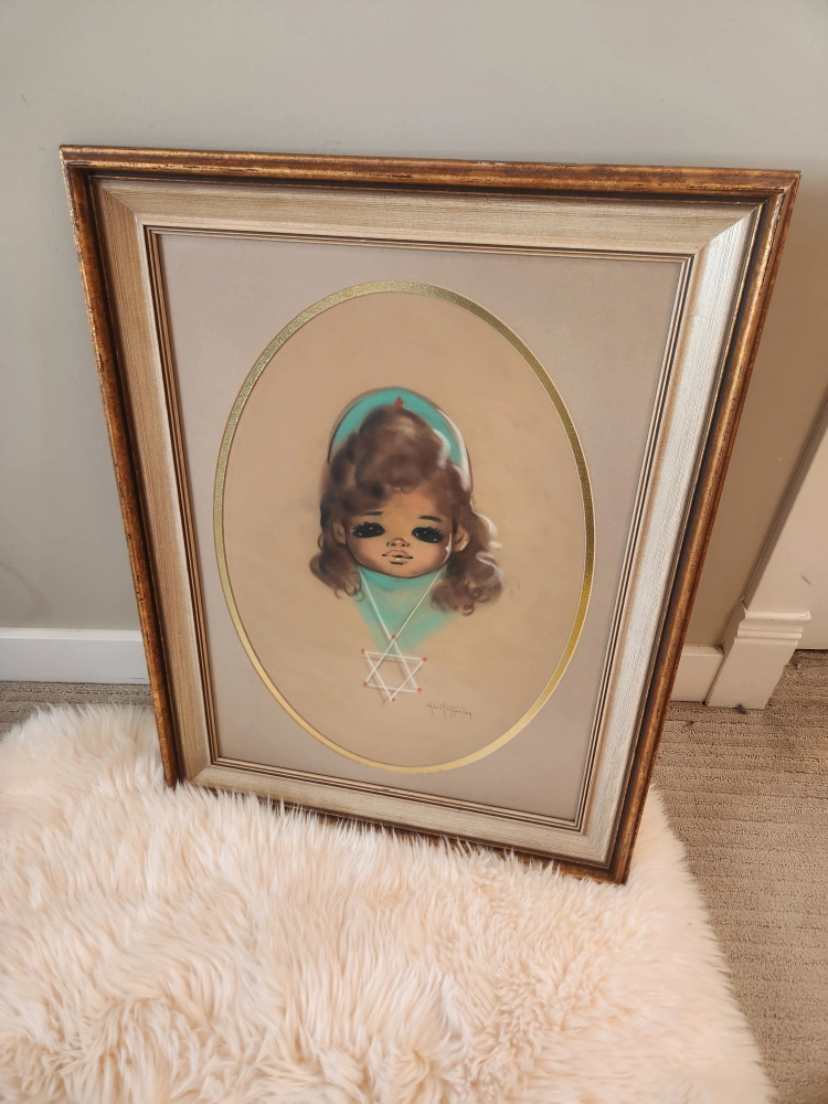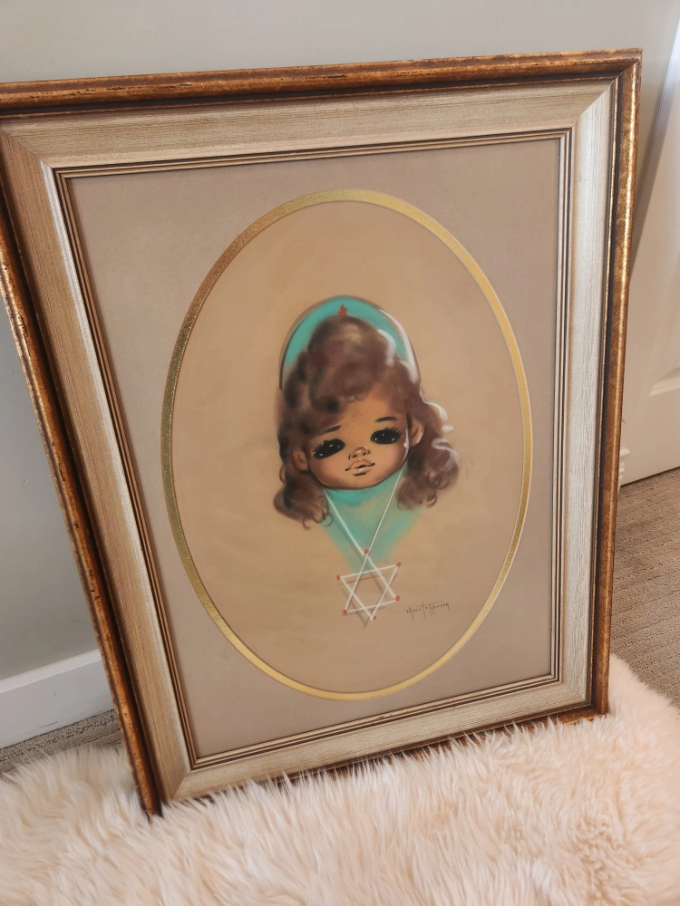 Mid Century wall art This ORIGNAL large delightful pastel by Gerda Gina Christofferson adds a pop of vintage beauty to any space! 24x31 inches this piece. In style of large eye children, this mid century piece is whimsically fantastic!Beautiful framed vintage art print. Features a whimsical illustration of a girl. Gold-toned frame. Oval-shaped inner mat.