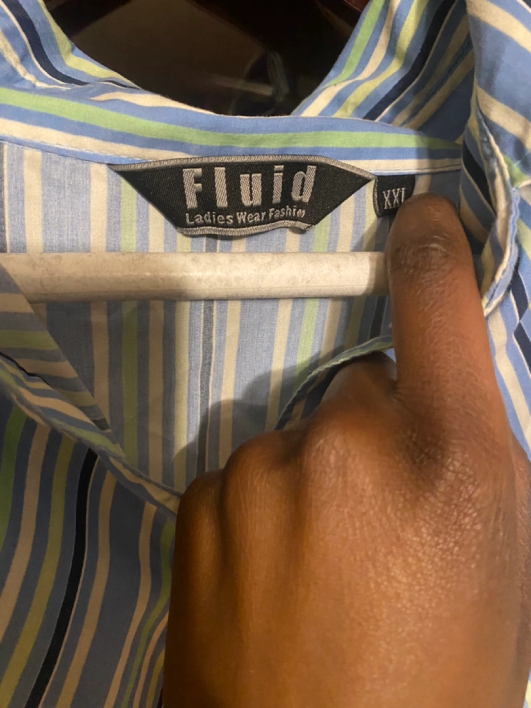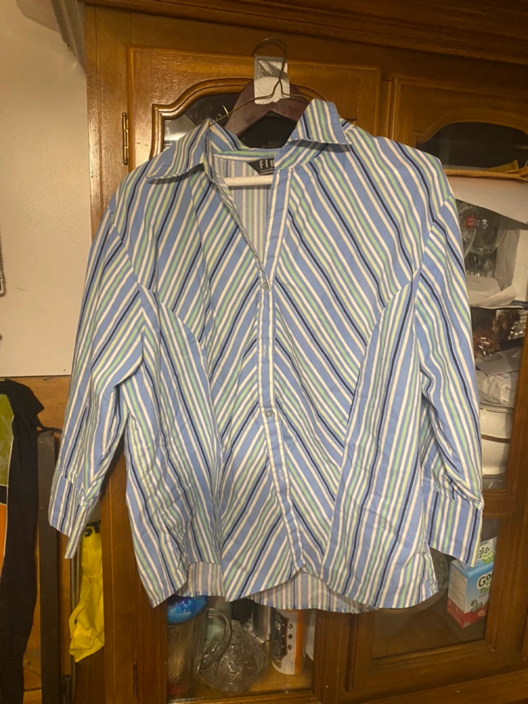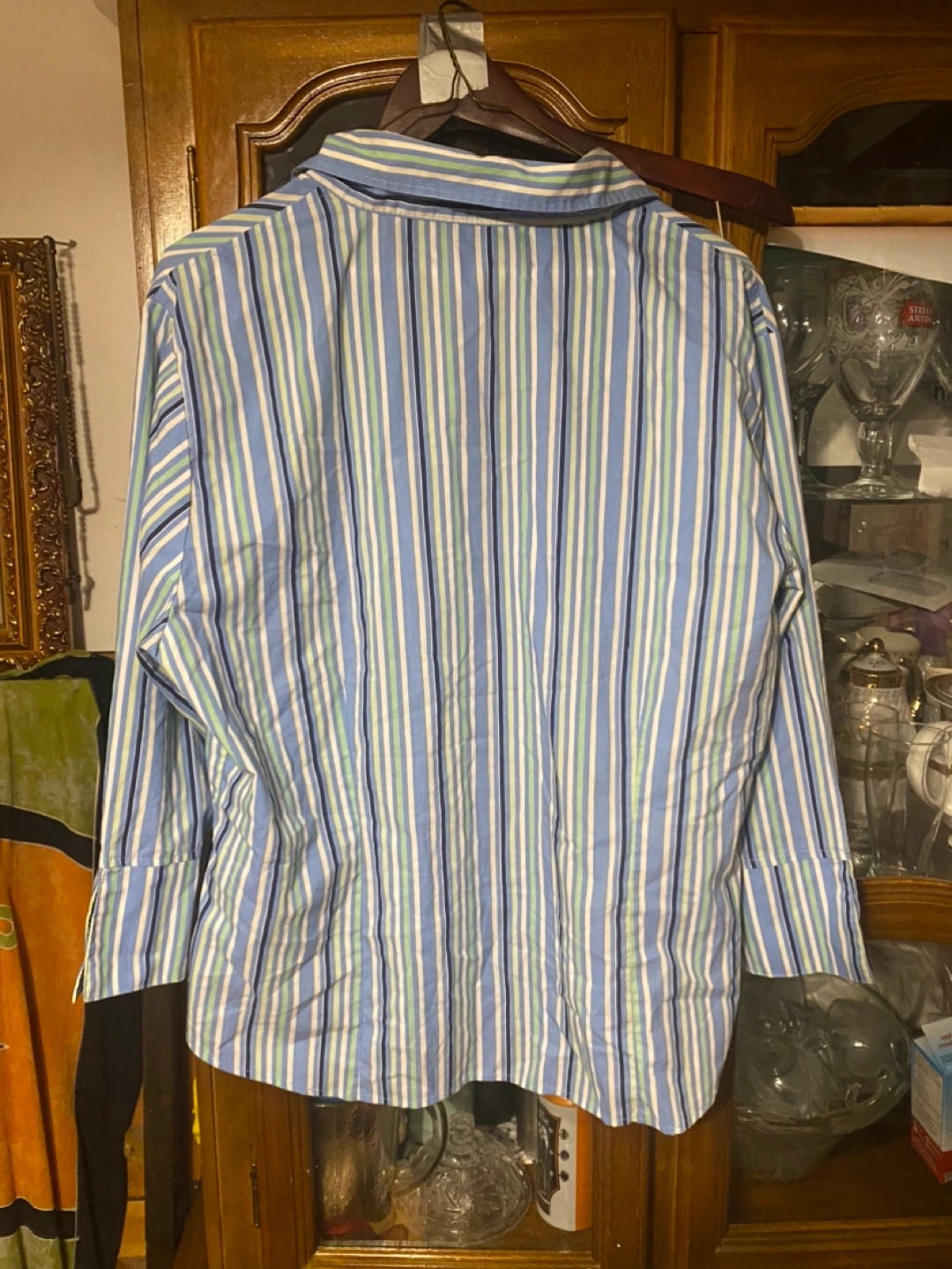 Women's XXL button-down shirt. Blue, green, and white vertical stripes. Long sleeves. Excellent pre-owned condition.