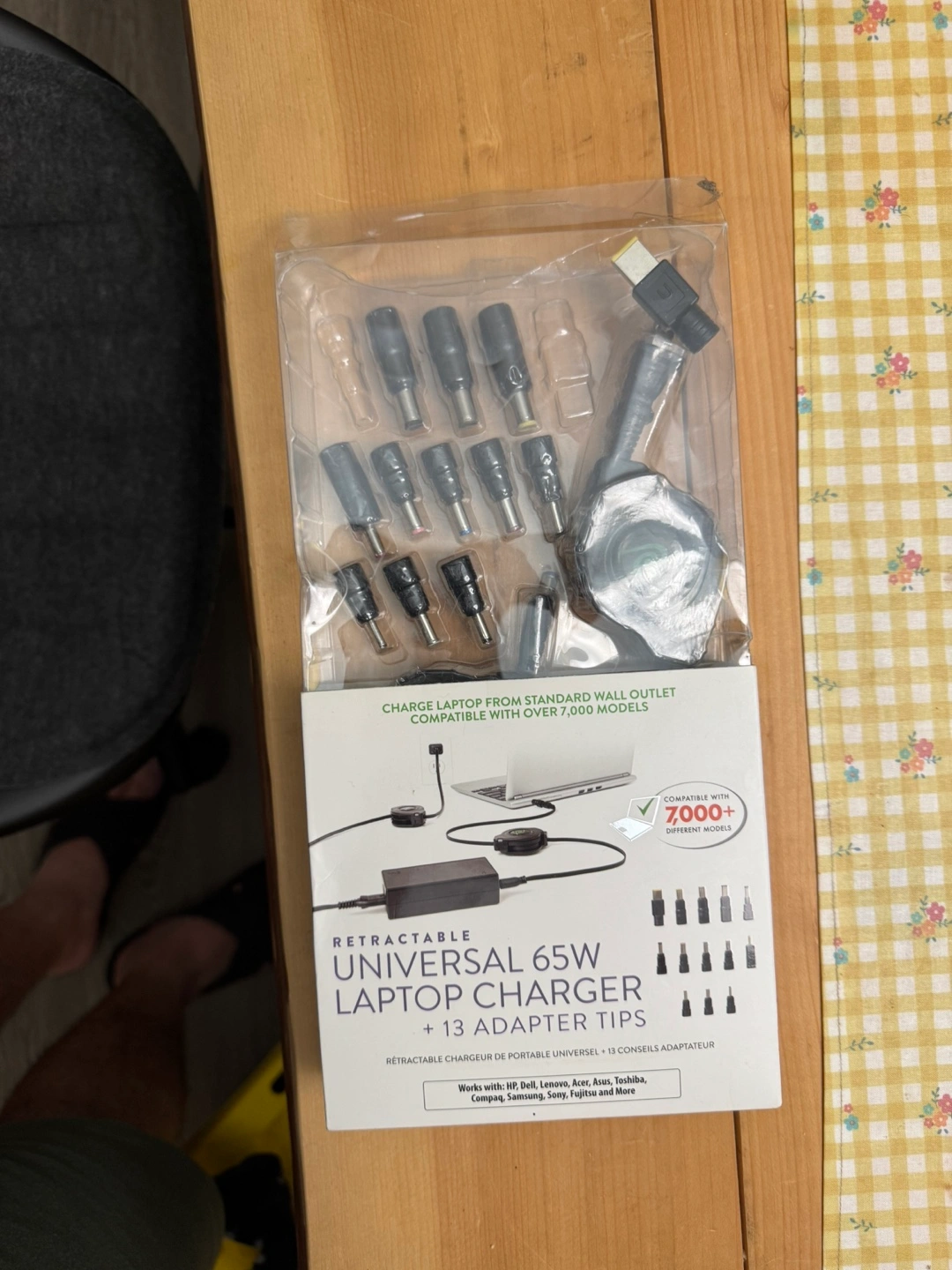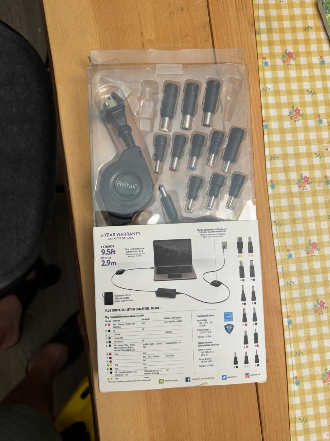 Retractable universal laptop charger. 65W. Includes 13 adapter tips. Compatible with 7000+ different models. 3-year warranty. 9.5ft cable.