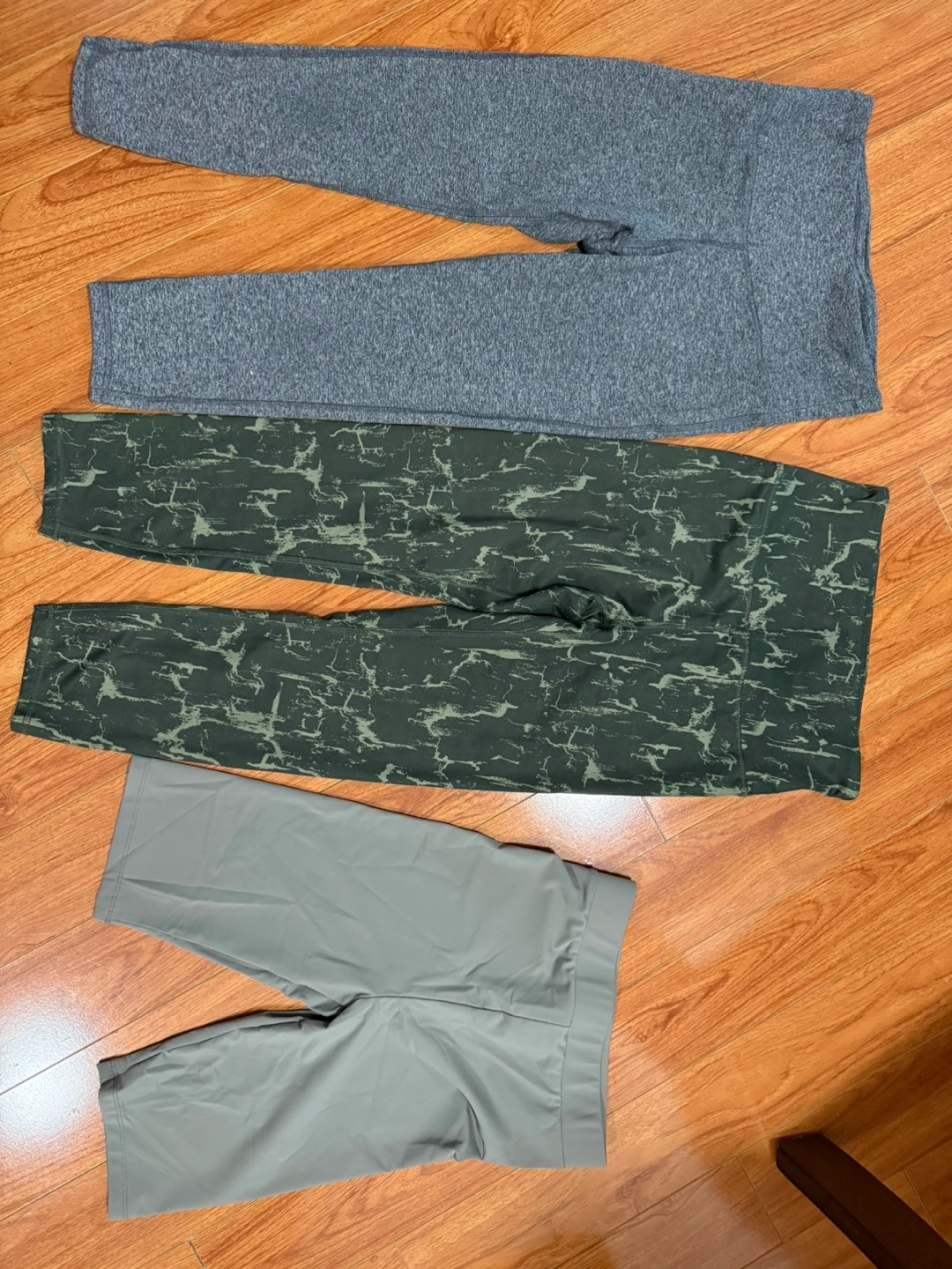Bundle includes two pairs of grey marl leggings and one pair of green marble print leggings. Also includes one pair of light grey/green biker shorts. Great for working out or lounging.
