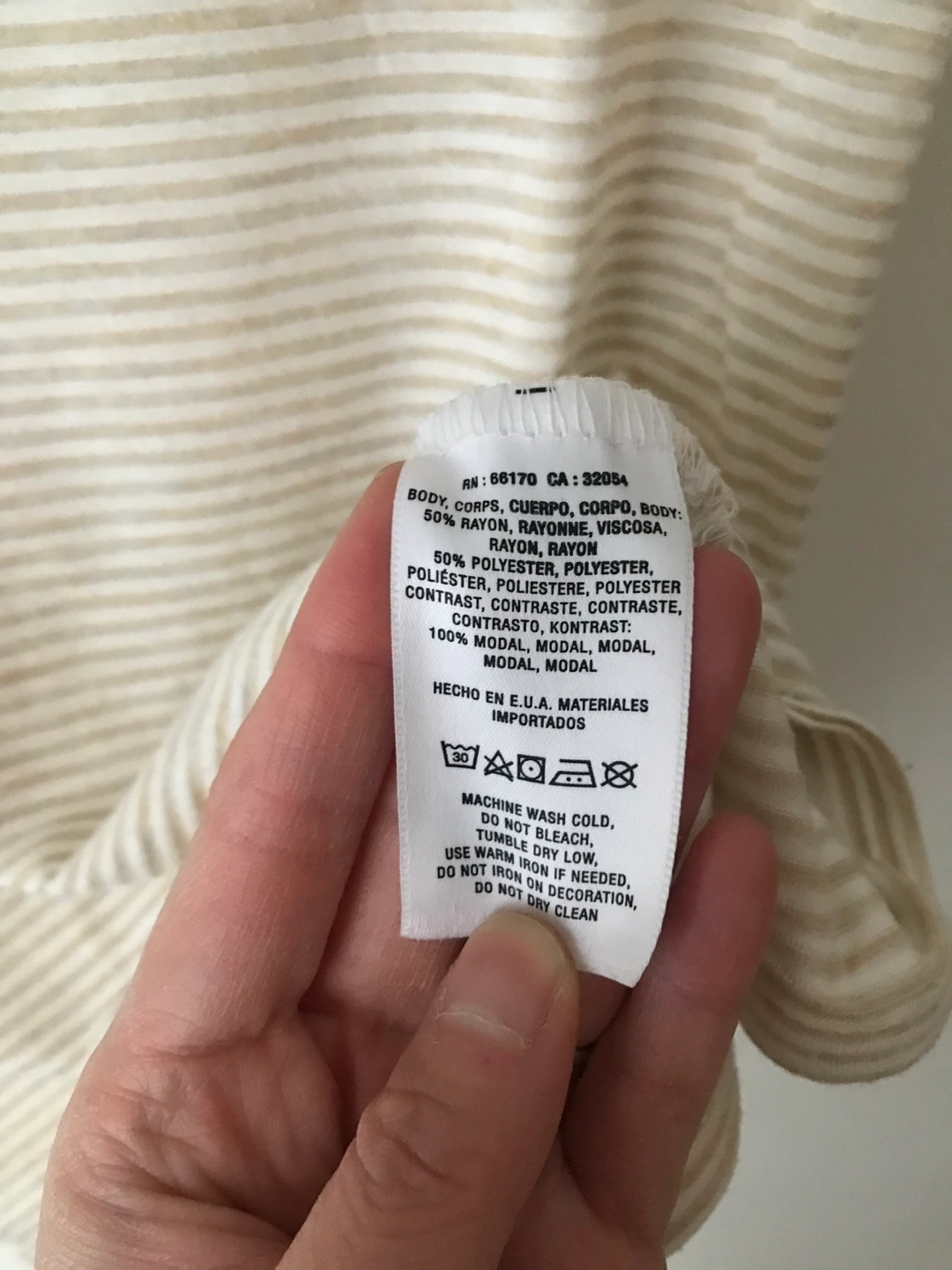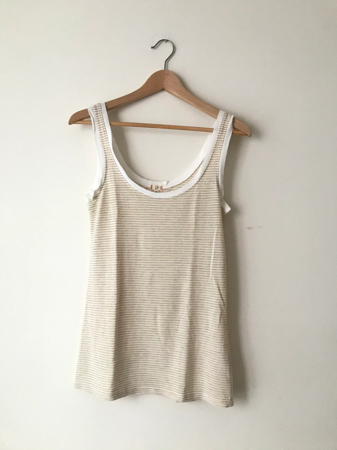 Beige and white striped tank top. Scoop neck. Made in the U.S.A. 50% Rayon, 50% Polyester. Contrast: 100% Modal.