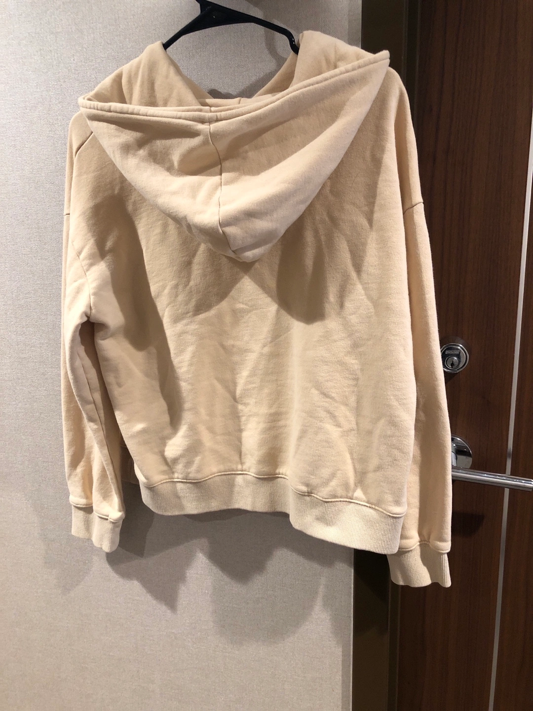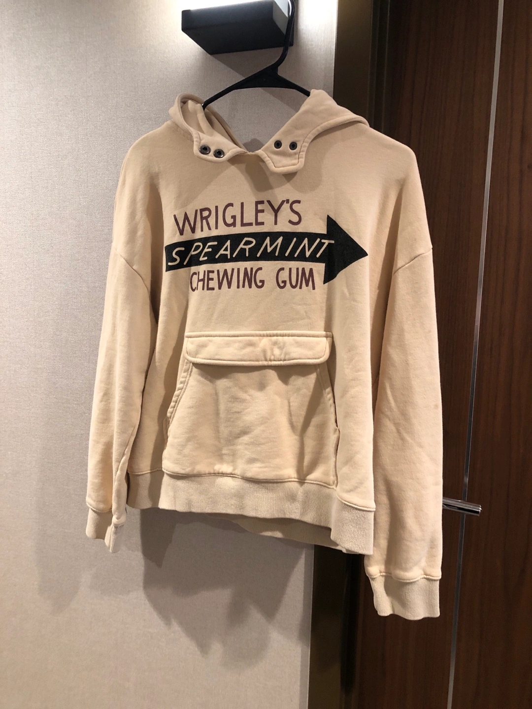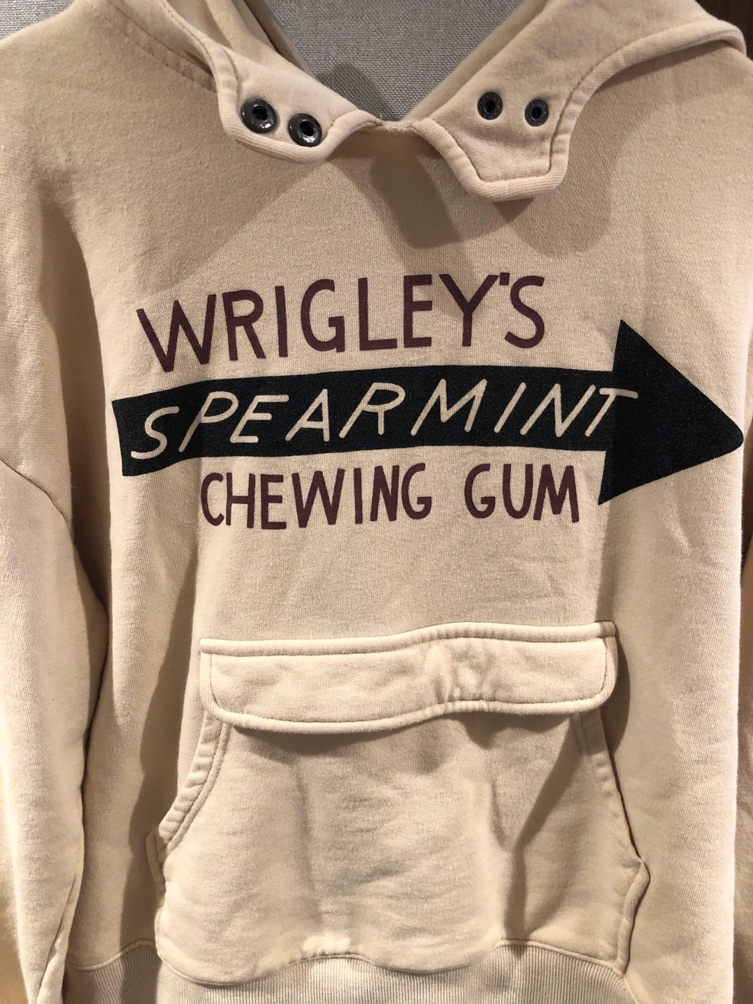 Cream-coloured hoodie. Features a vintage-inspired graphic of the Wrigley's Spearmint Chewing Gum logo. Kangaroo pocket. Buttoned hood.