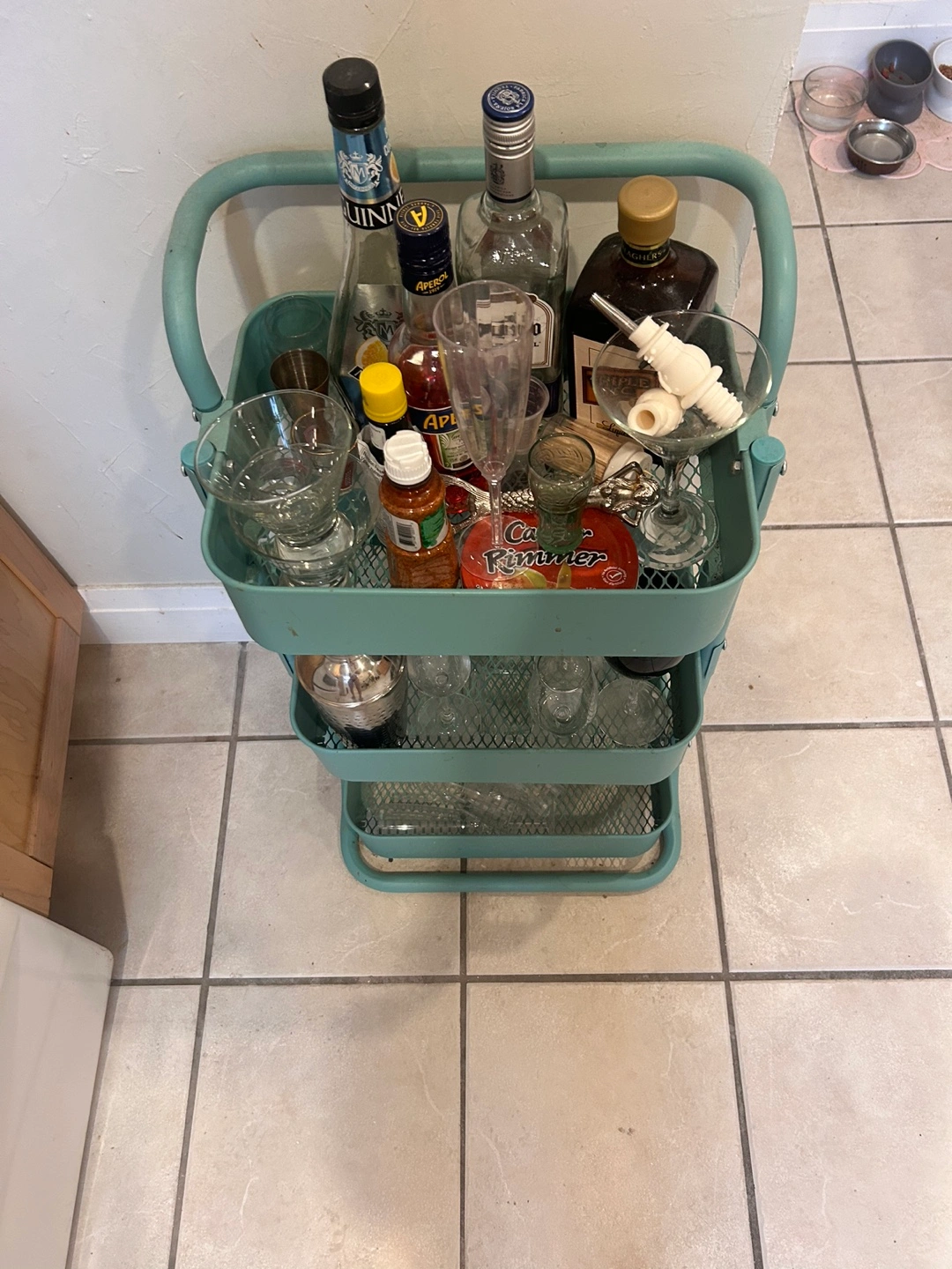 Three-tiered metal rolling bar cart. Teal coloured. Holds bottles, glasses, and bar tools. Some minor wear. Can also be used for plants! Pick up downtown Whitby