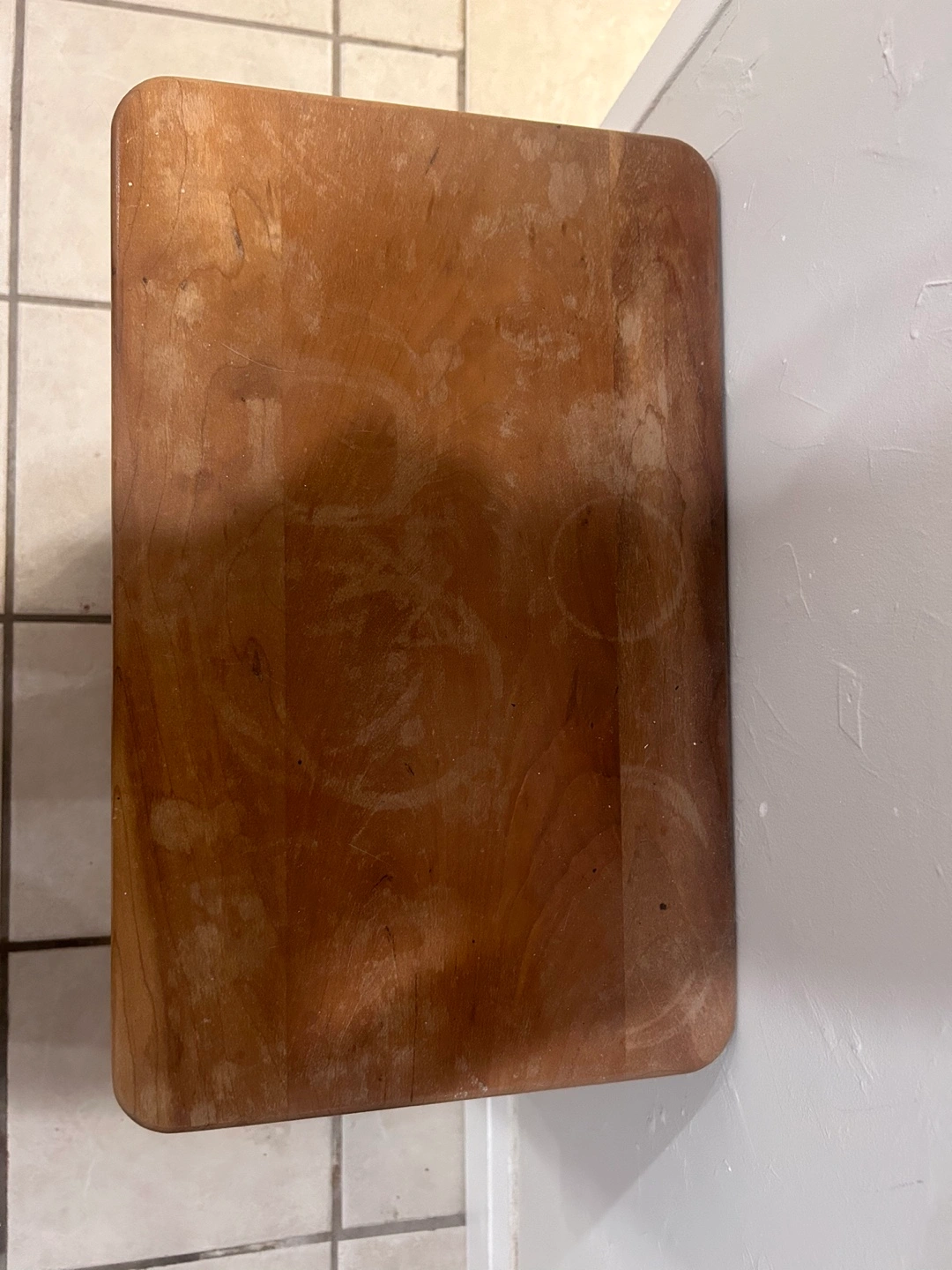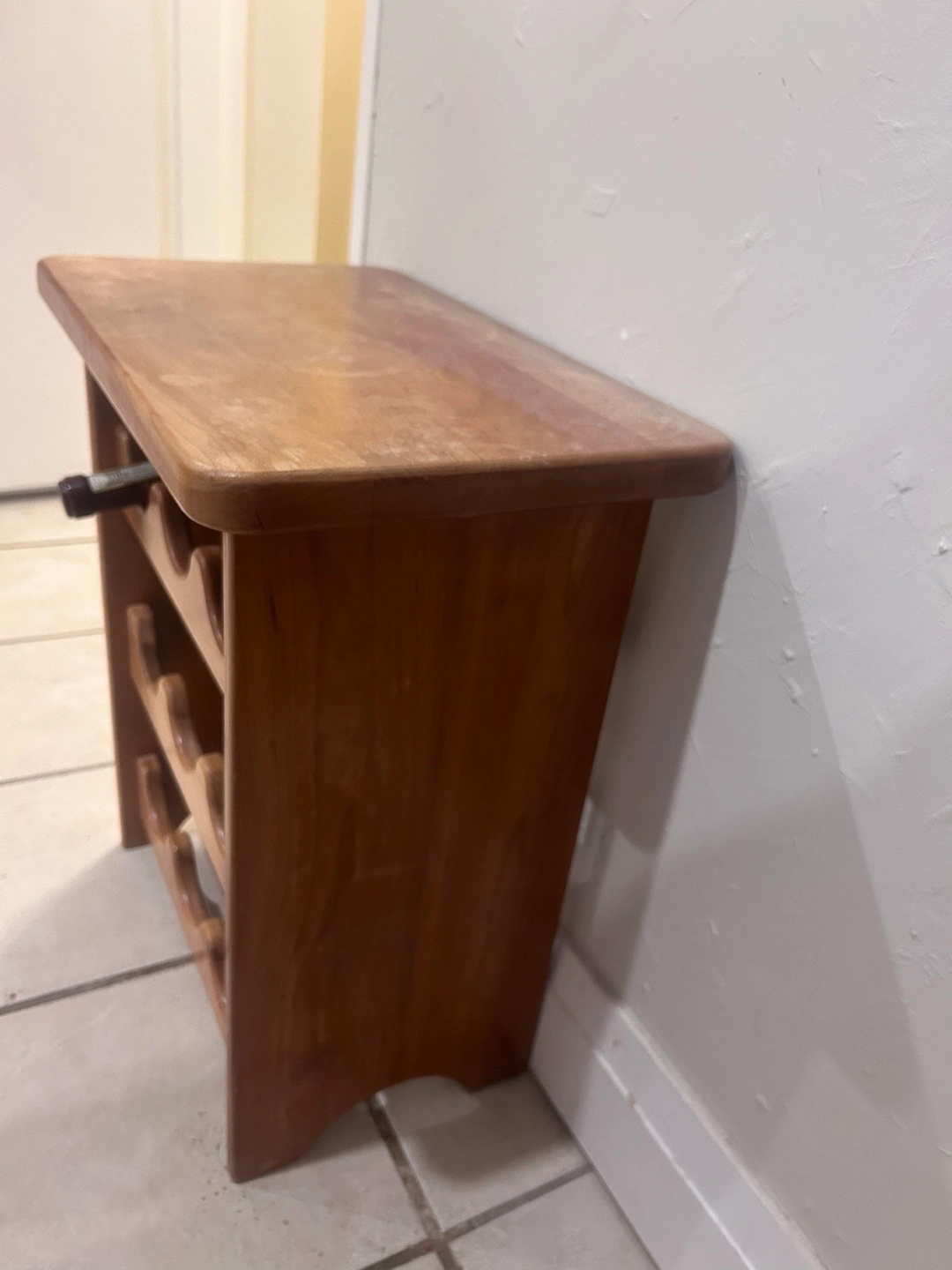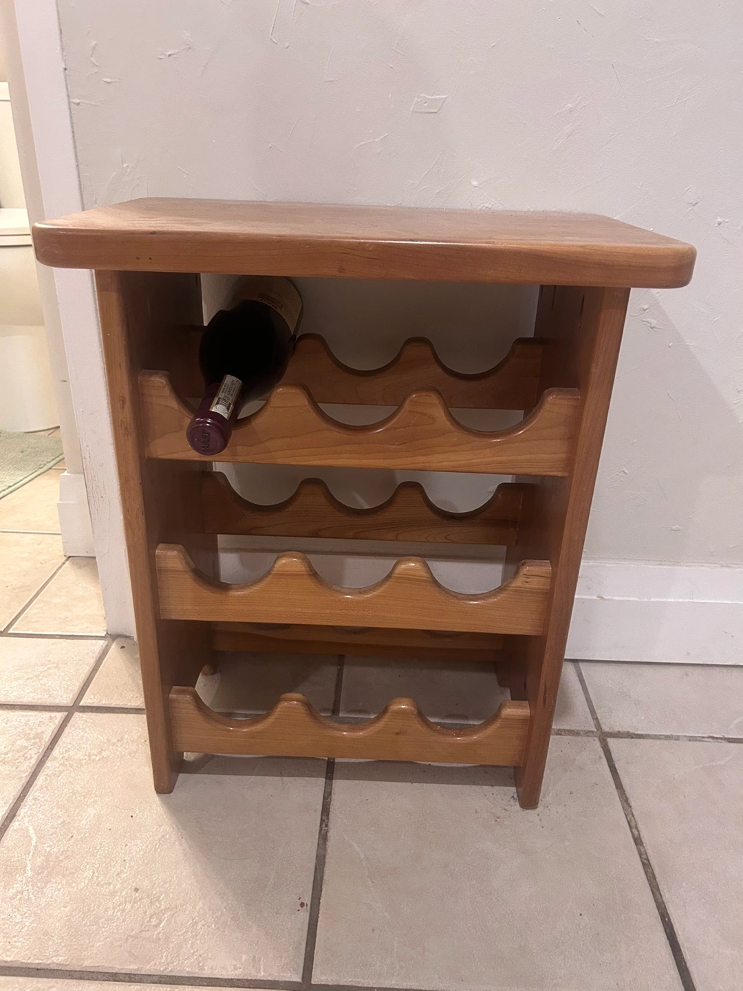 Small wooden wine rack. Holds approximately 12 bottles. Features a flat top surface. Shows some wear. Can be a fun DIY project to paint or keep as is