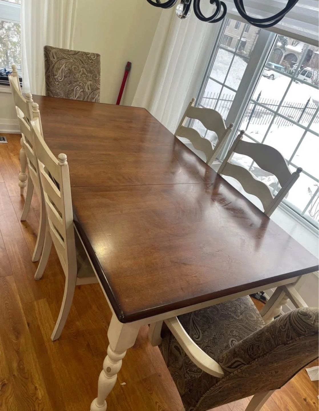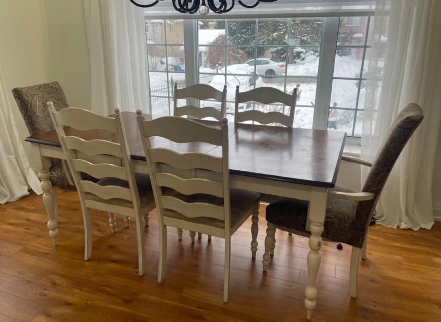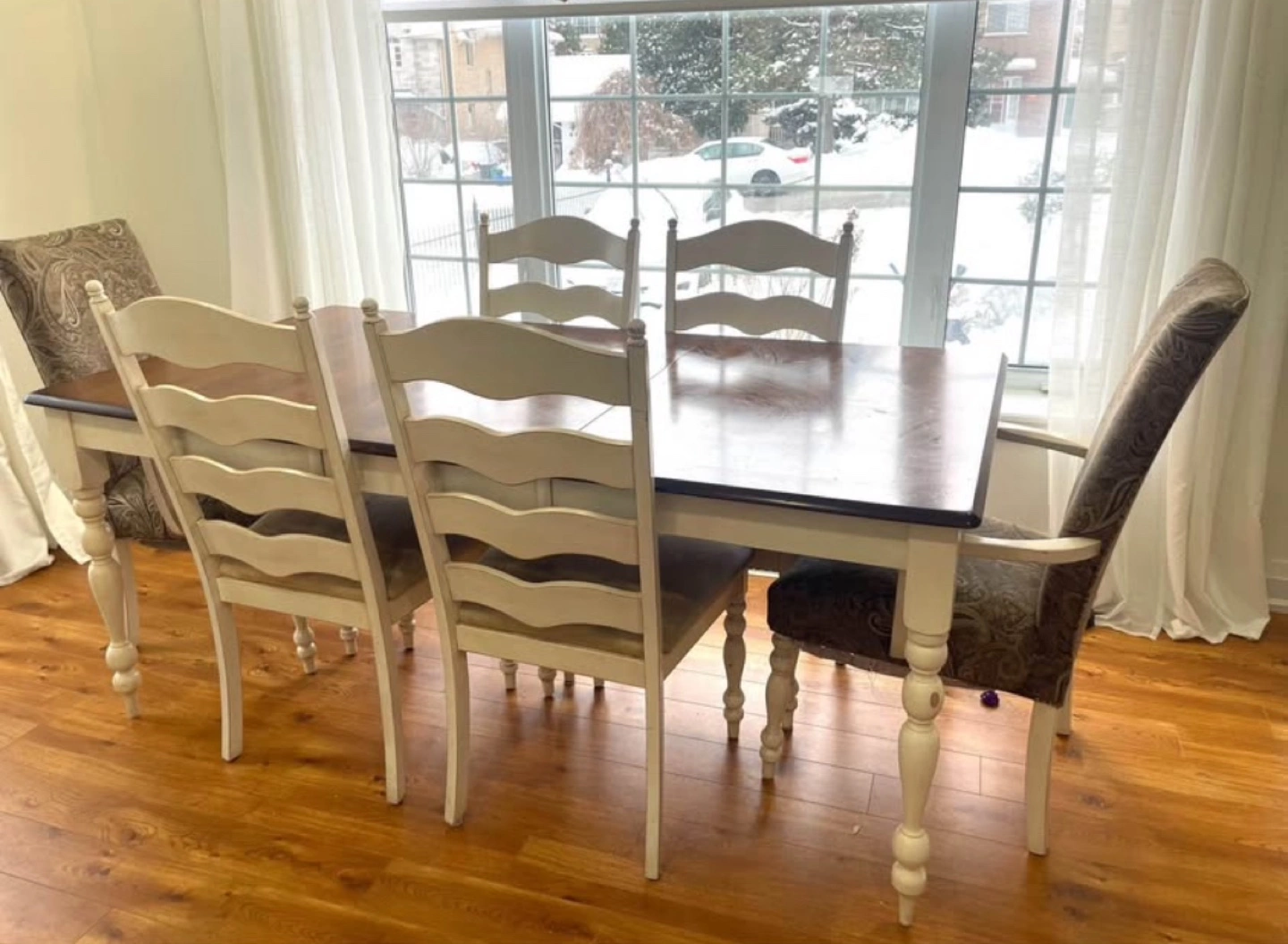37Beautiful 6-piece dining set. Cream-coloured chairs with turned legs. Table features a dark brown top and leaf. Solid wood construction. Excellent condition. Measurements: 38” x 72” x 30” (W x L x H) Price is negotiable, pick up only