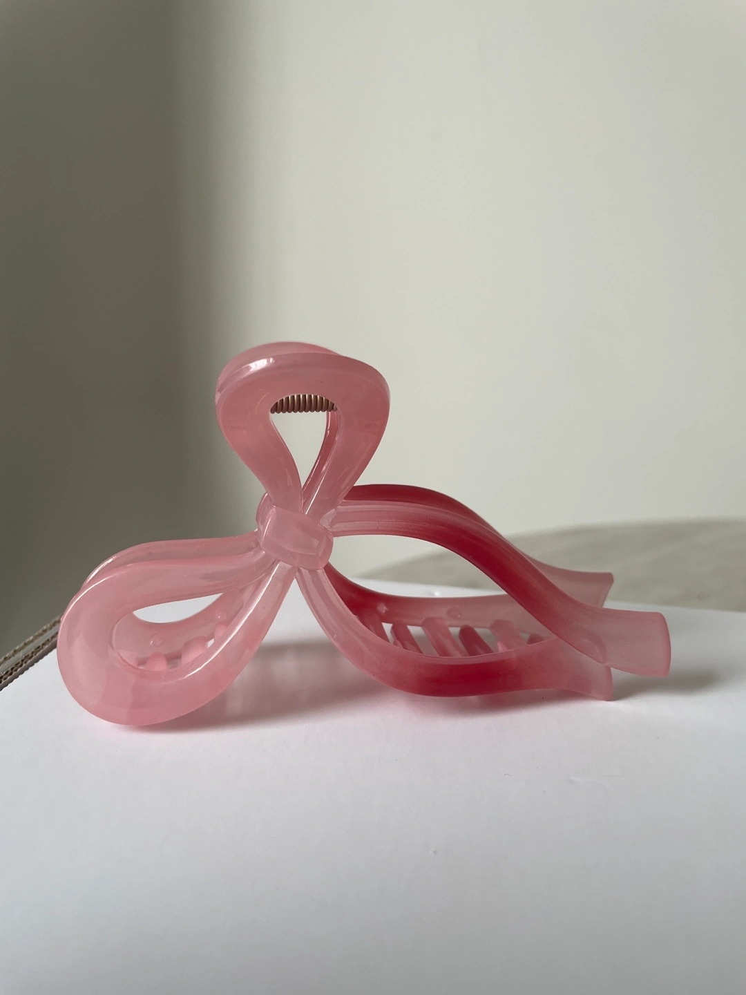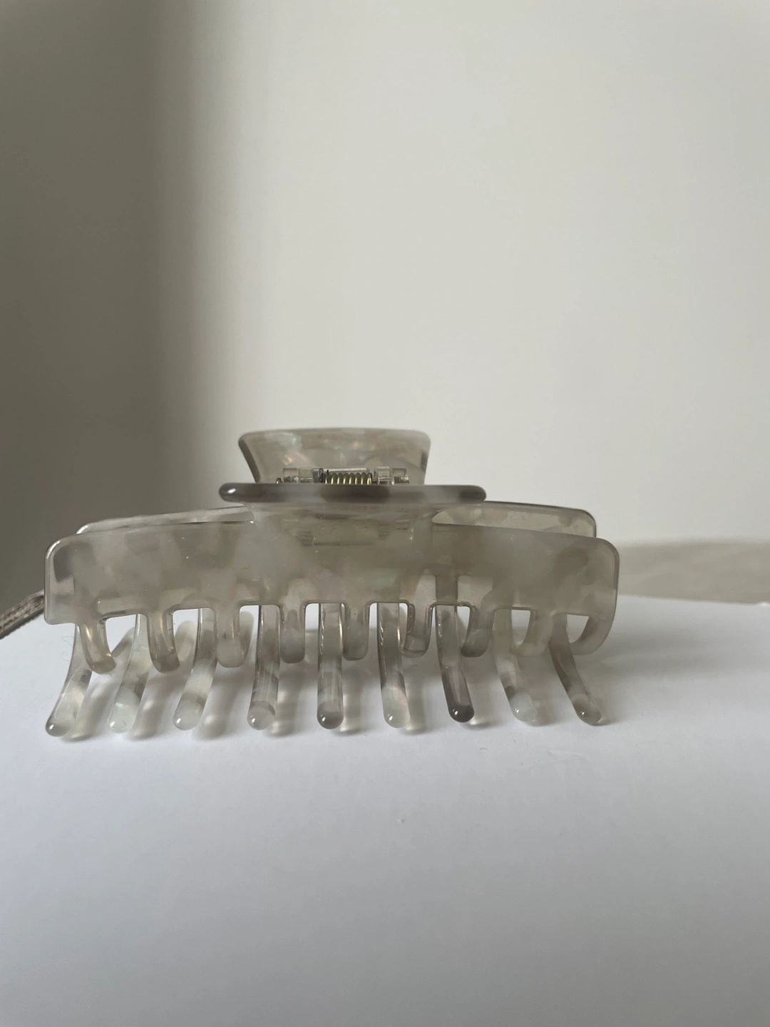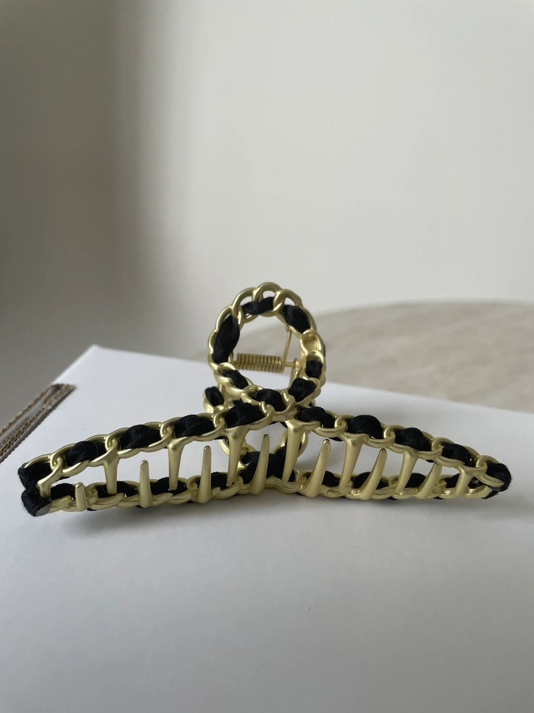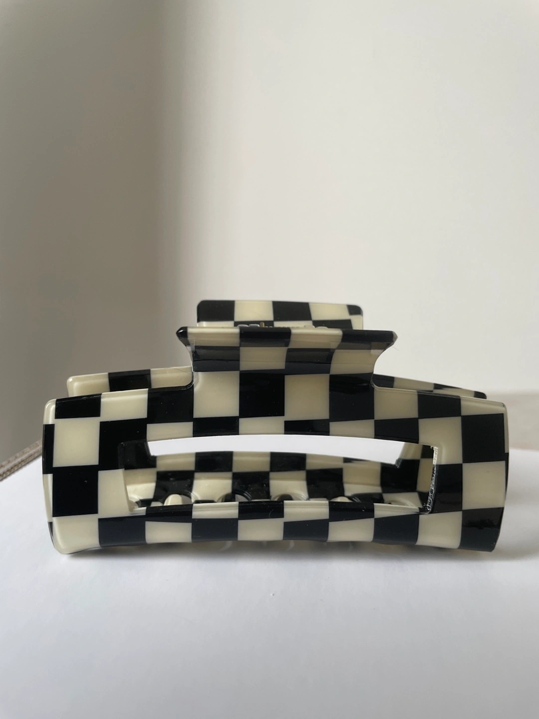 Five assorted hair claw clips. Includes black and white checkered, black chain, beige faux fur, translucent grey, and pink bow designs. Great for styling various hairstyles. $5 each
