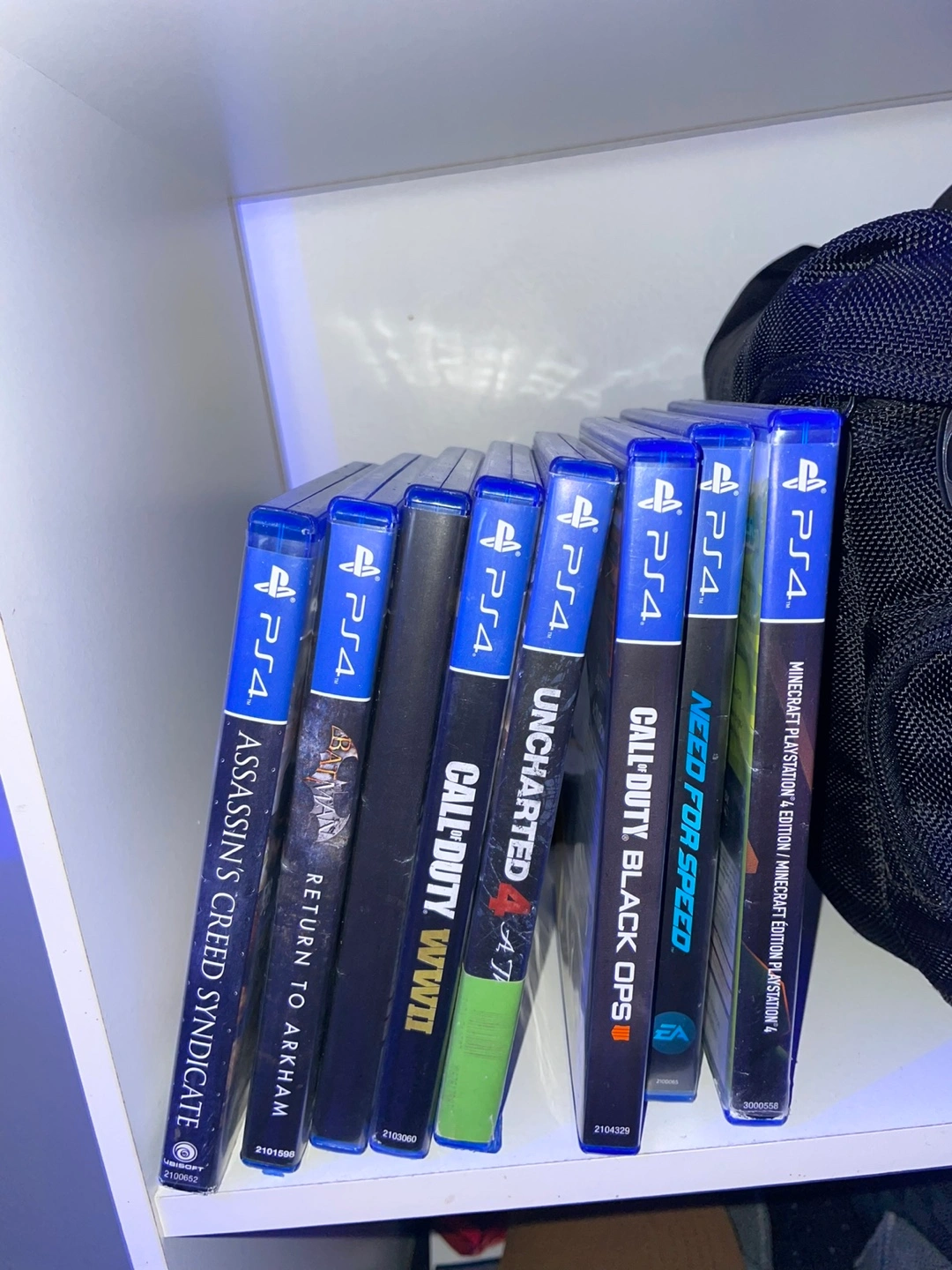 PlayStation 4 console. Custom Jordan-branded faceplate. Two camouflage DualShock 2 controllers included. Eight PlayStation 4 games: Assassin's Creed Syndicate, Batman: Return to Arkham, Call of Duty WWII, Uncharted 4, Call of Duty: Black Ops III, Need for Speed, and two others. Minor wear and tear expected.