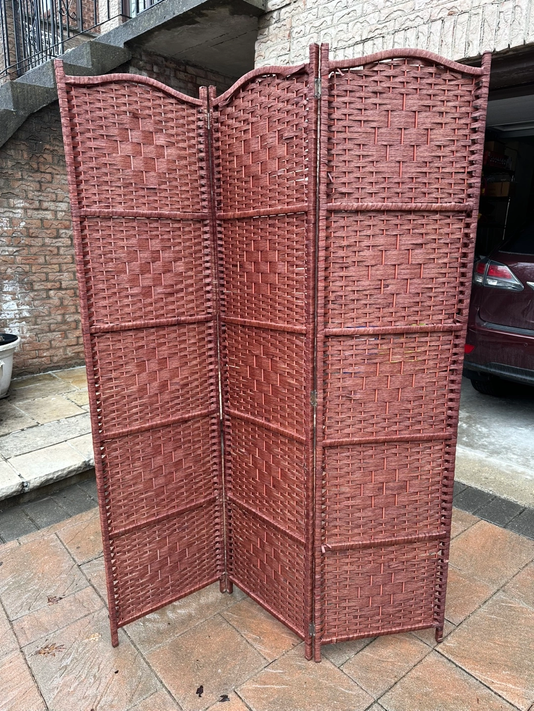 Three panel room divider. Dark brown wicker. Good condition. Adds privacy or decorative flair.