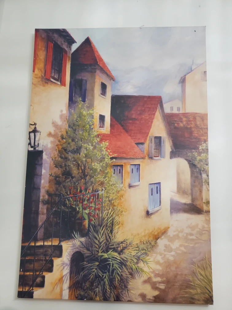 Beautiful canvas print. Depicts a quaint European village street. Features colourful buildings, lush greenery, and a sun-drenched pathway. Ready to hang.
