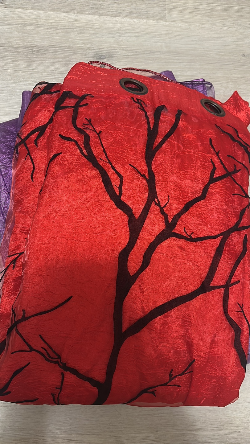 Set of two sheer curtain panels. One purple, one red with black tree branches. Grommet top. Beautiful colours, great for adding a touch of elegance to any room.