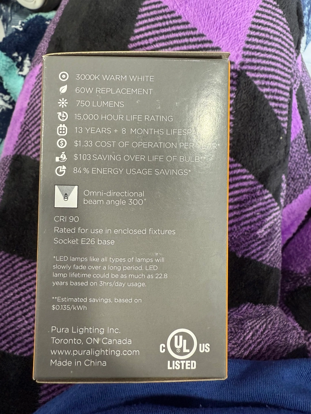 New in box. 9W LED bulb. 60W replacement. 750 lumens. 3000K warm white. Dimmable. A19 shape. E26 base. Energy efficient.