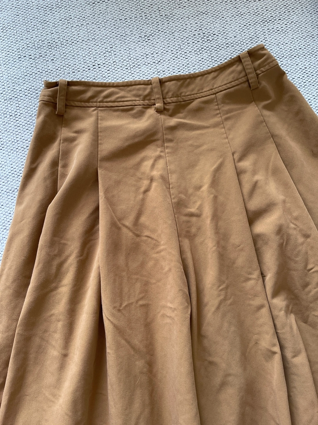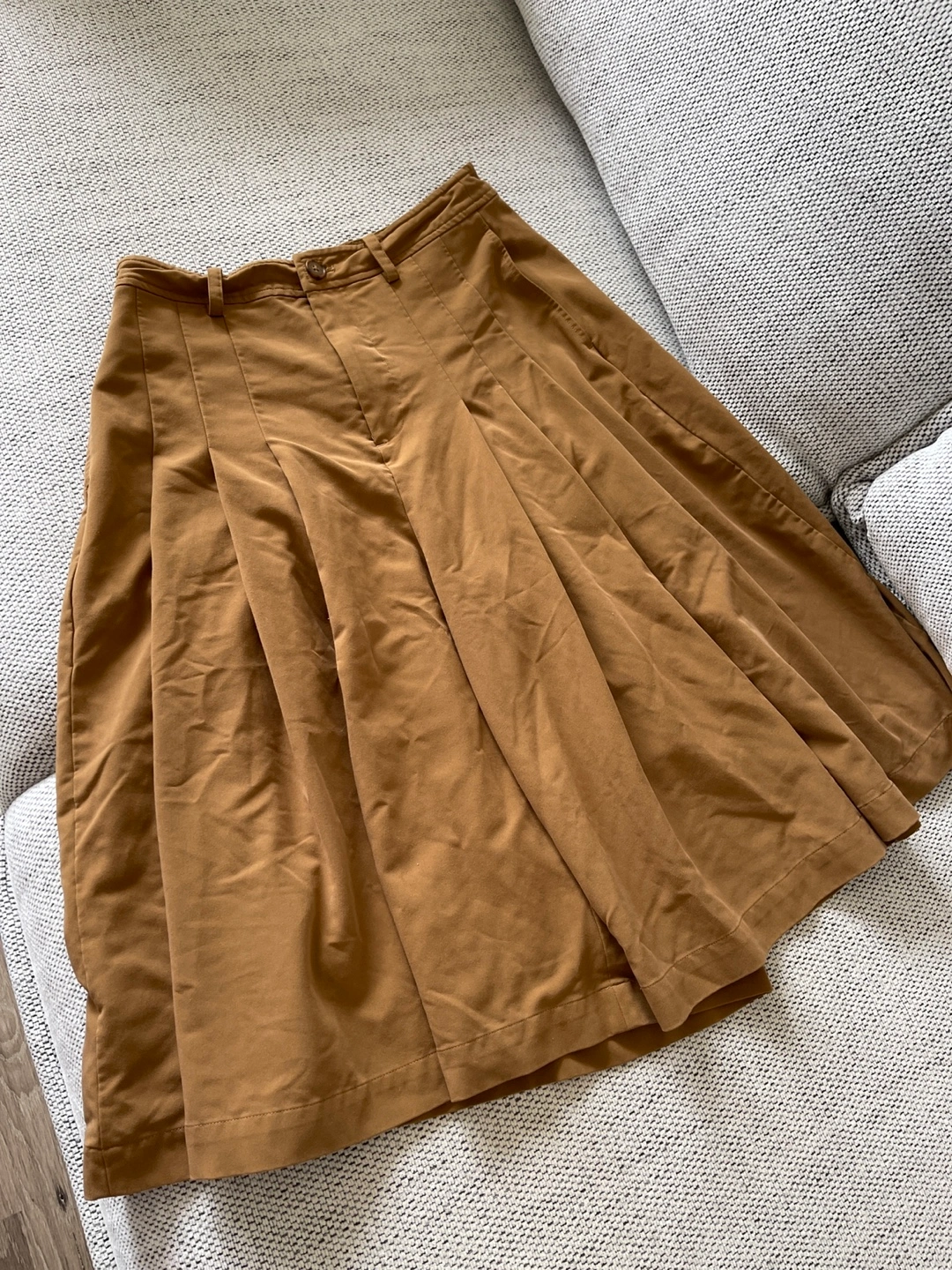 Brown midi pants but after wearing, it will looks like a skirt. Pleated design. Button closure. Relaxed fit. Good condition.