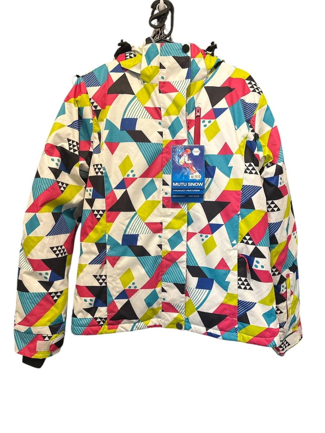 Youth girls' ski jacket. Colorful geometric print. Features a hood and zipper closure. Water resistant.