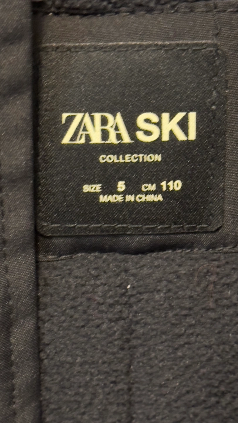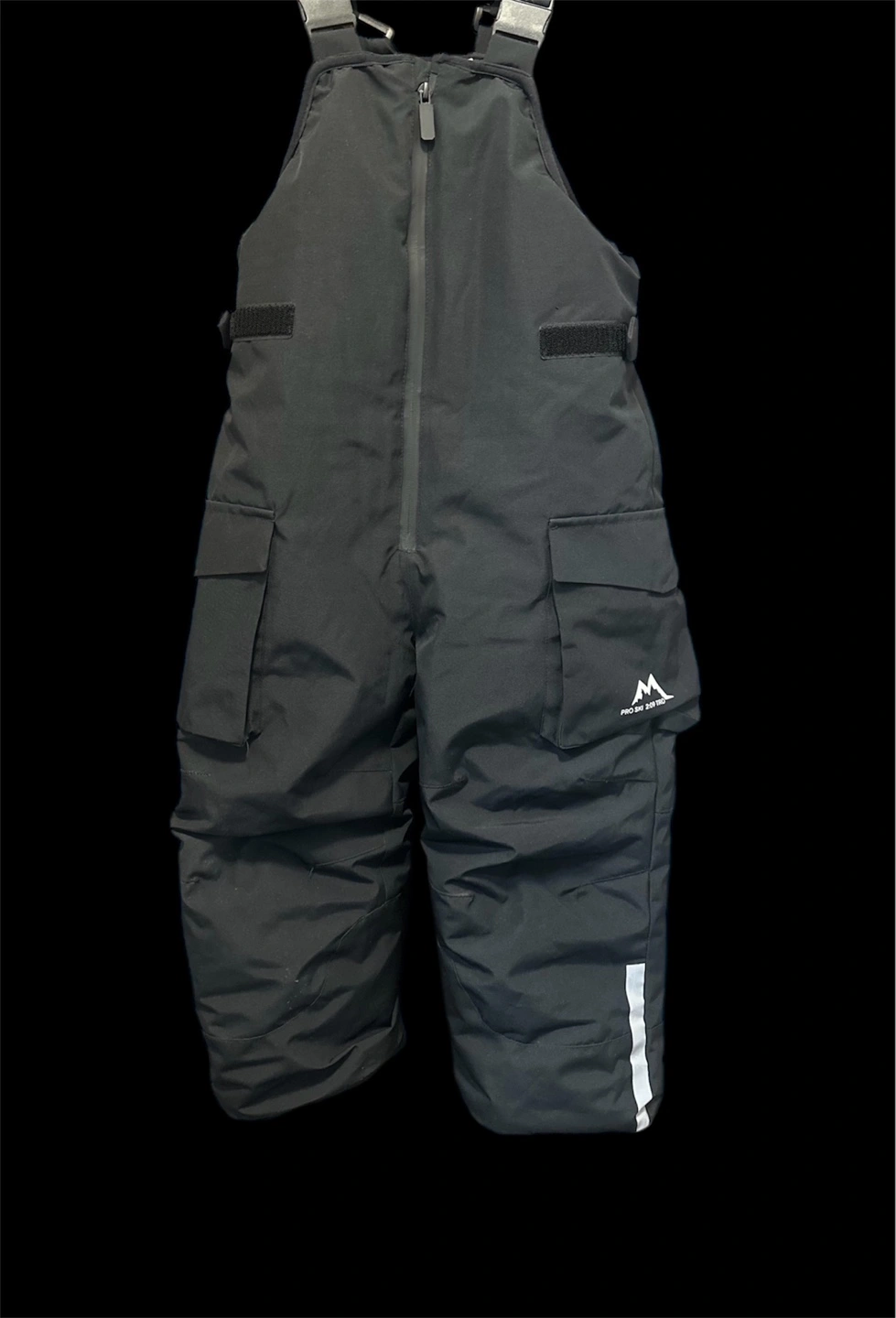 Black snow pants. Size 5. Features two pockets. Zipper closure. Adjustable straps. Made in China.