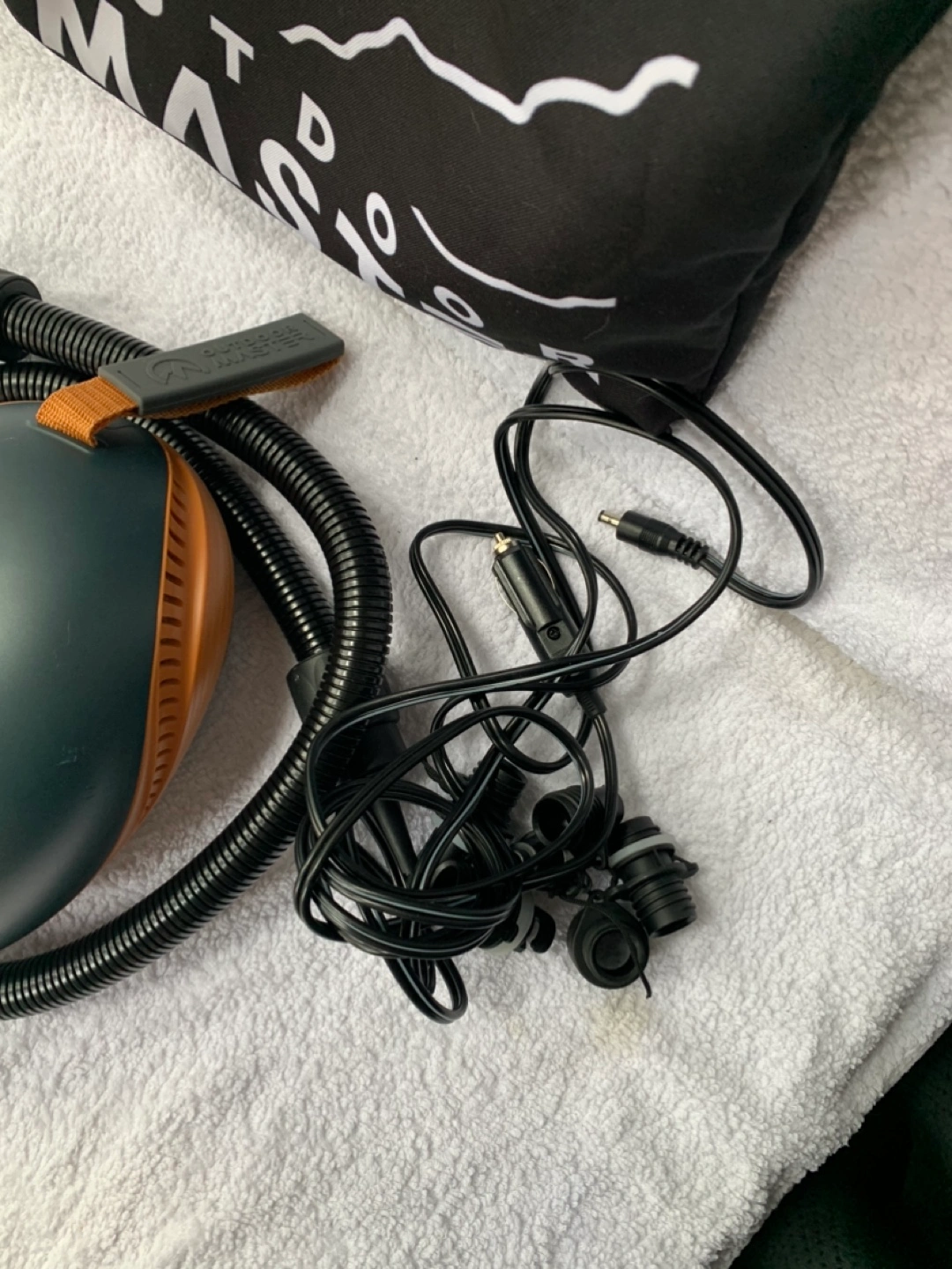 Portable 12V air pump. Includes multiple nozzle attachments and carry bag. Connects via 12V car cigarette lighter port. Great for inflatables.