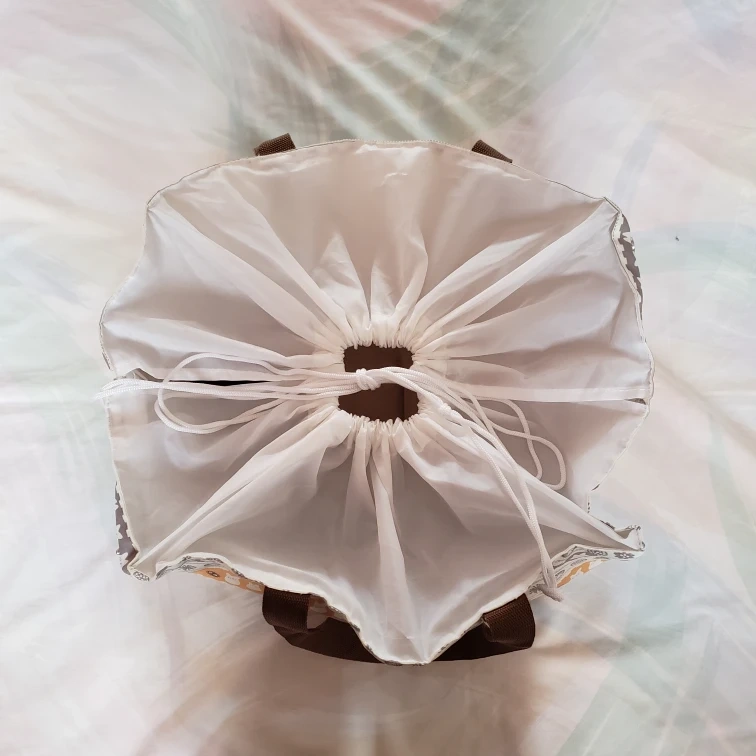 Features a drawstring closure, side buttons and a front pocket