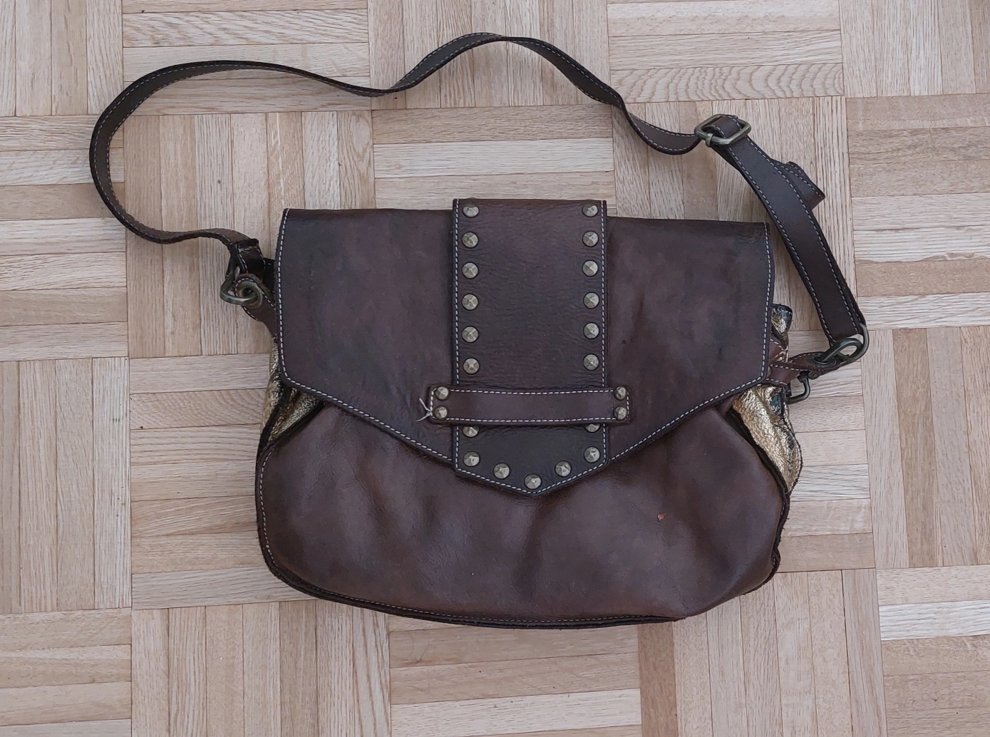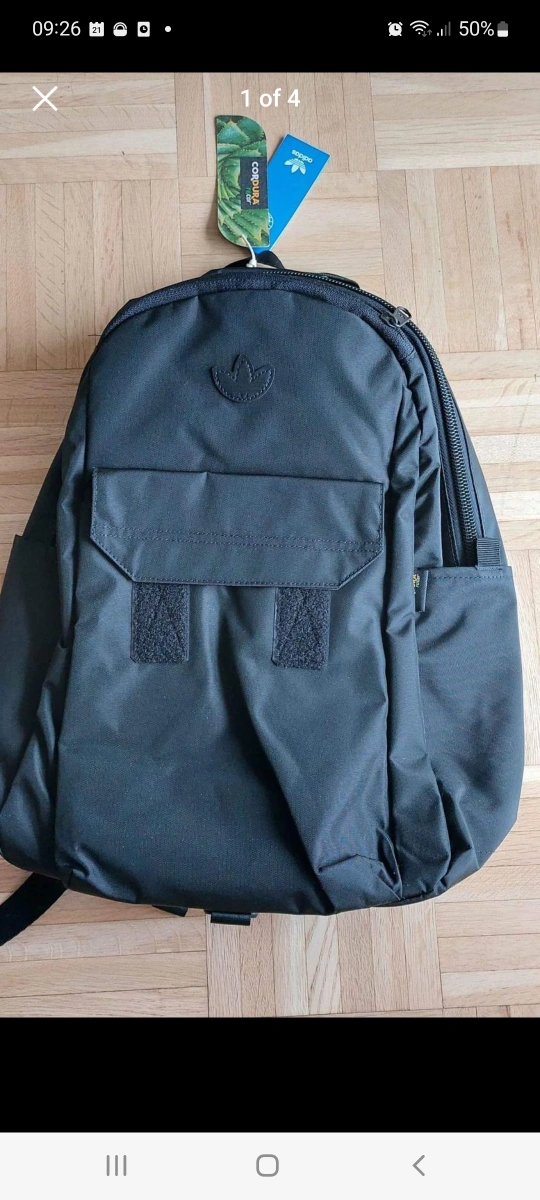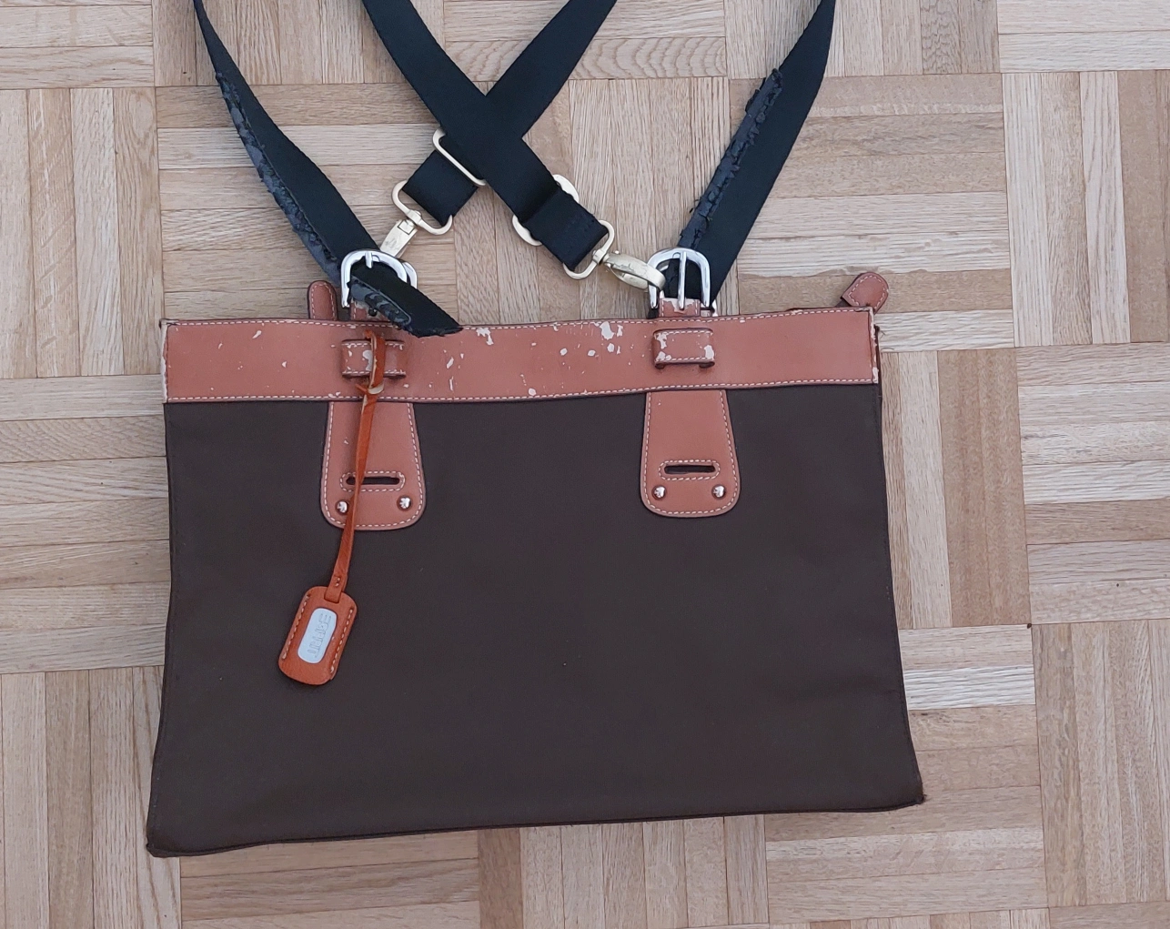 A black rolling shopping tote with wheels and a shoulder strap. A leather backpack with a zippered pocket. A black tote bag with a white geometric pattern. A black leather handbag with silver hardware. Various styles and materials.