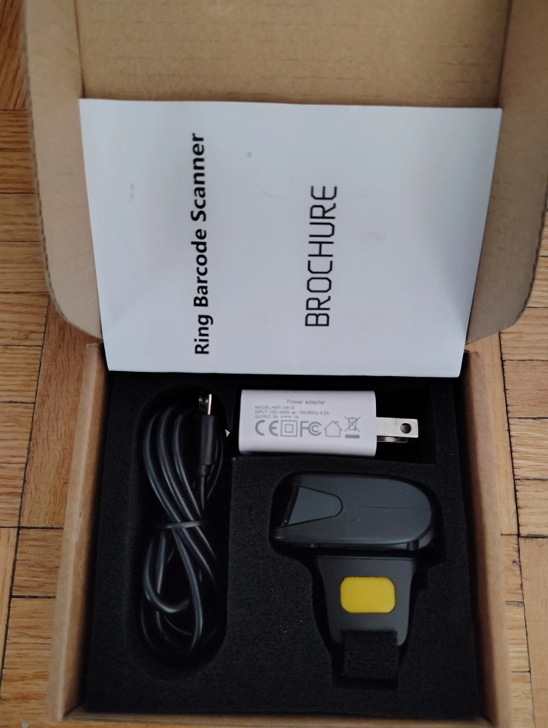 585New ring barcode scanner. Includes USB charging cable and power adapter. Great for inventory or point of sale.