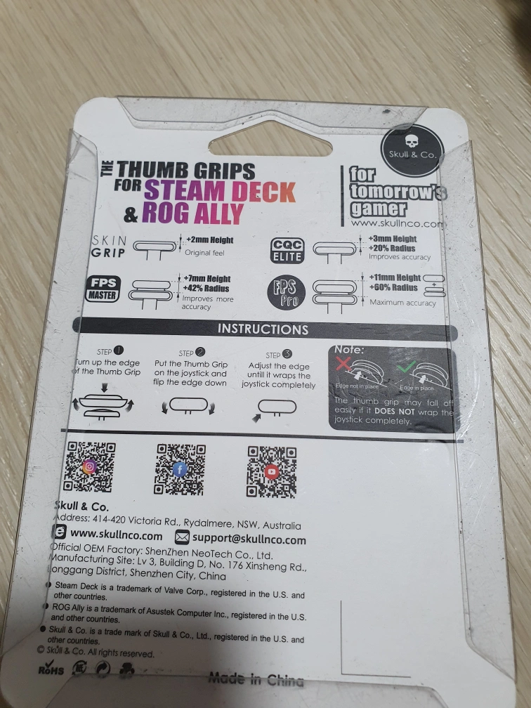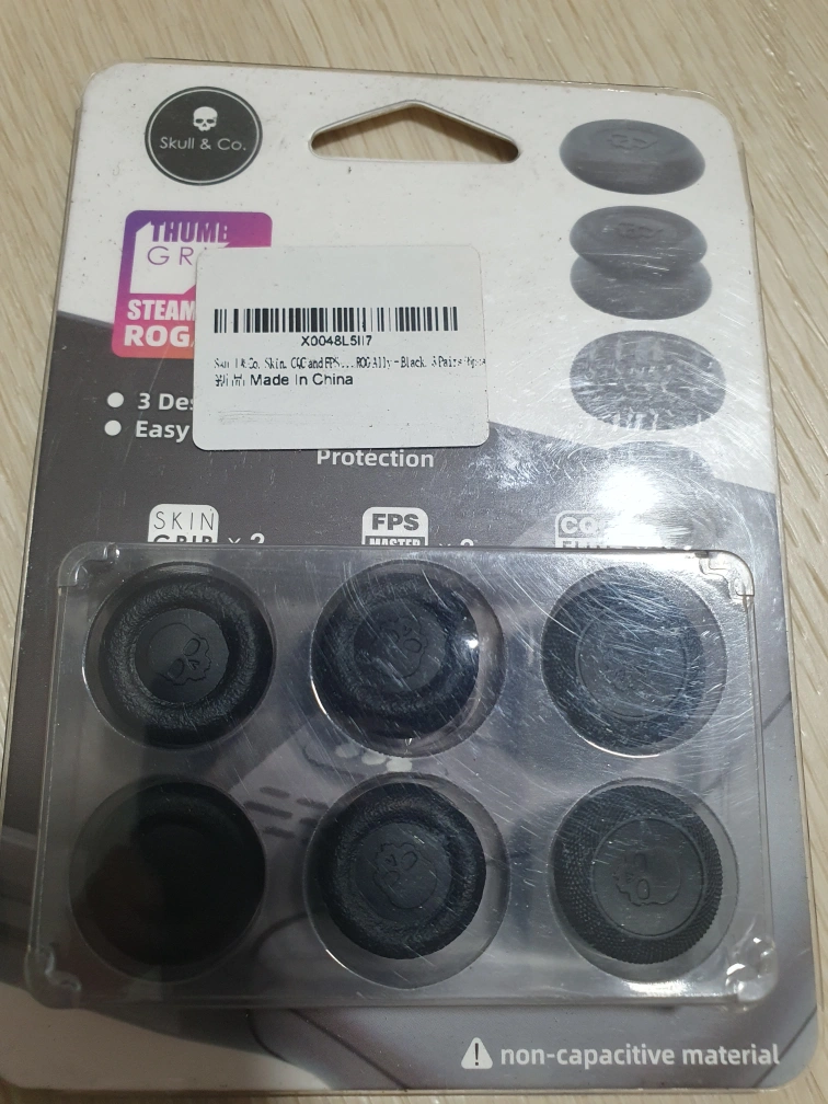 Black thumb grips. Designed for Steam Deck and ROG Ally. Improves accuracy and provides better feel. Easy installation. Non-capacitive material. Made in China.