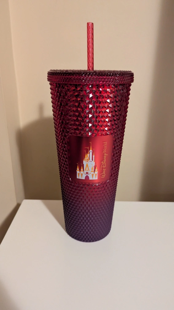 Limited edition Starbucks cold cup. Features a textured, studded design. Red ombre colour. Includes a straw. Disney World logo.