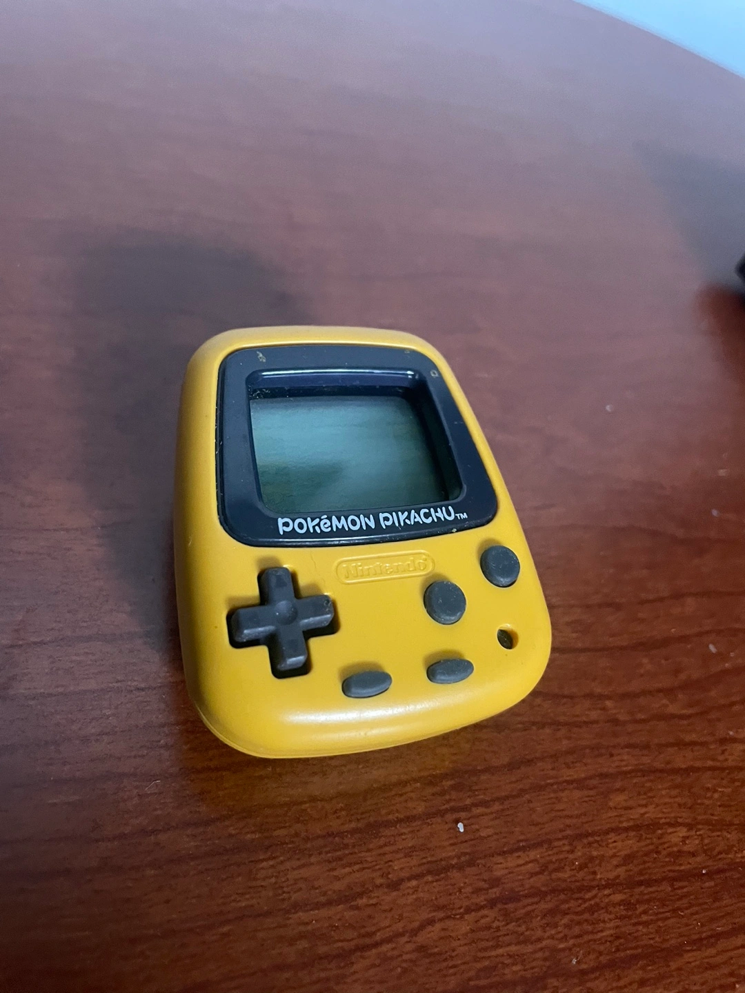 Yellow handheld electronic pet. Features a small screen and directional pad. Clip on the back. Shows some wear.