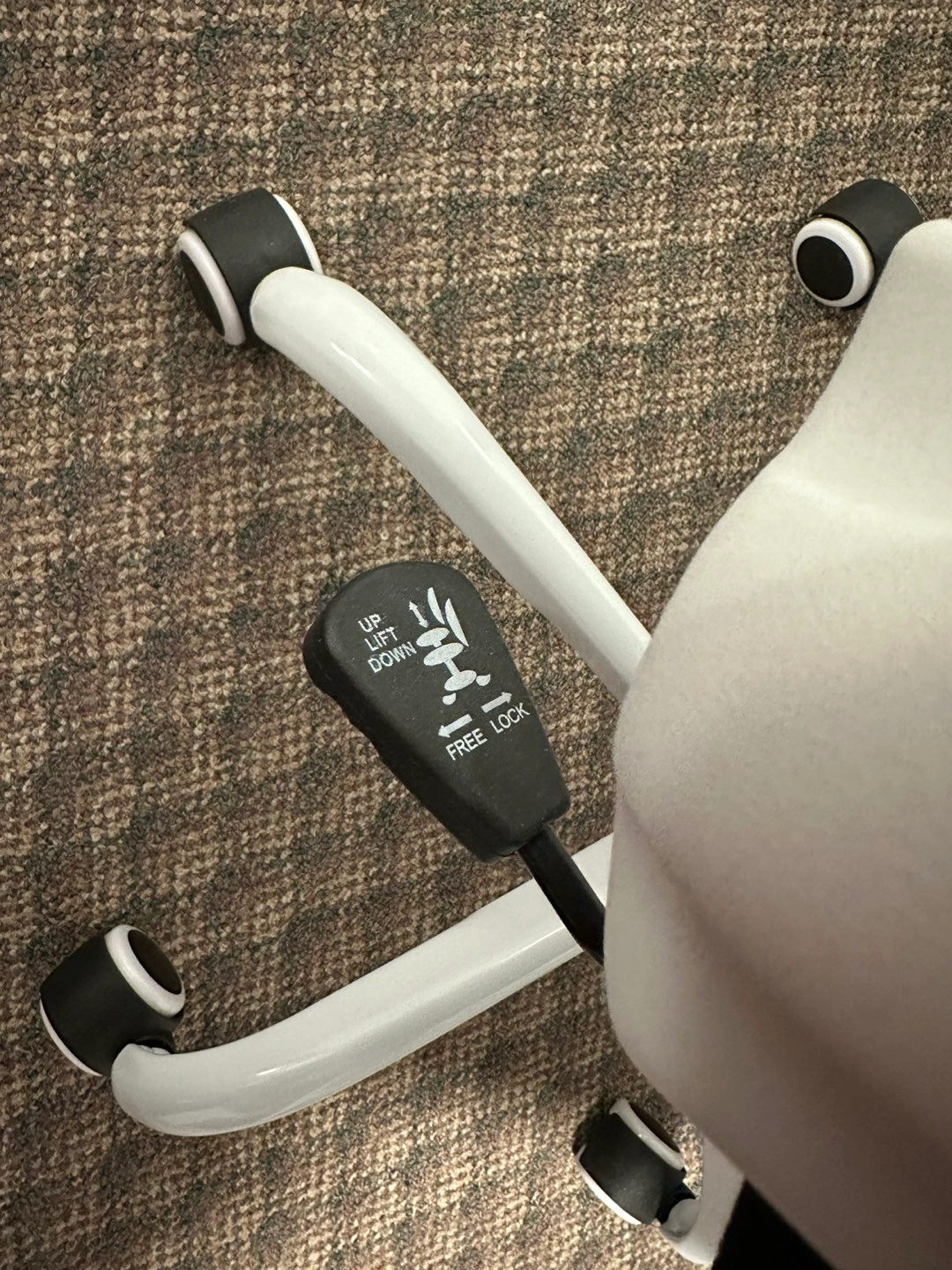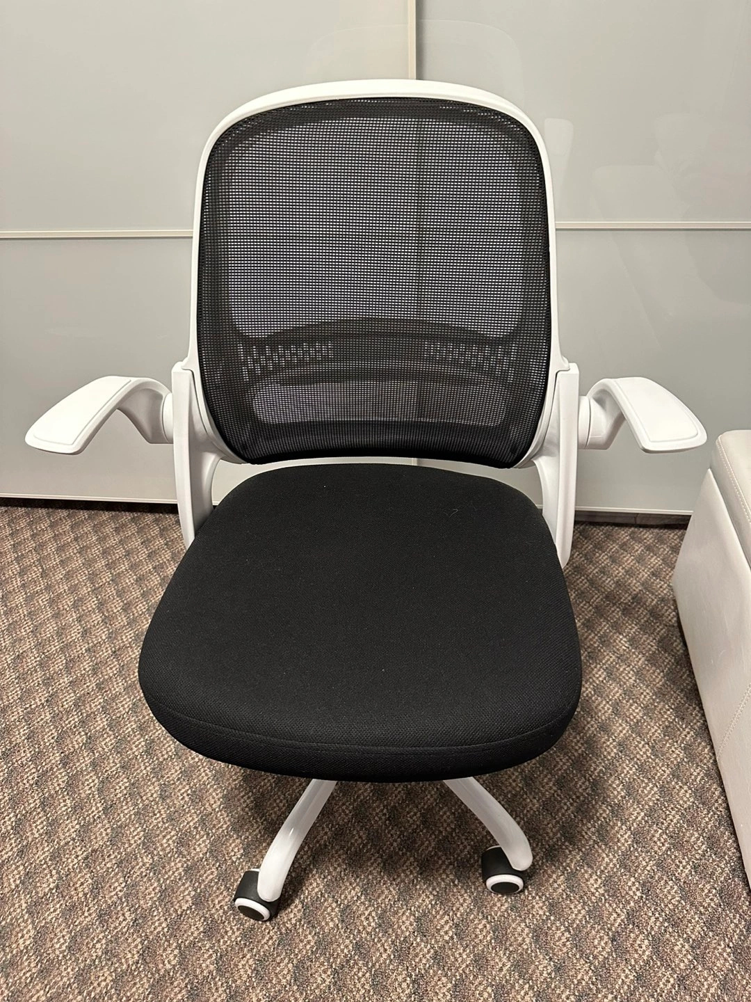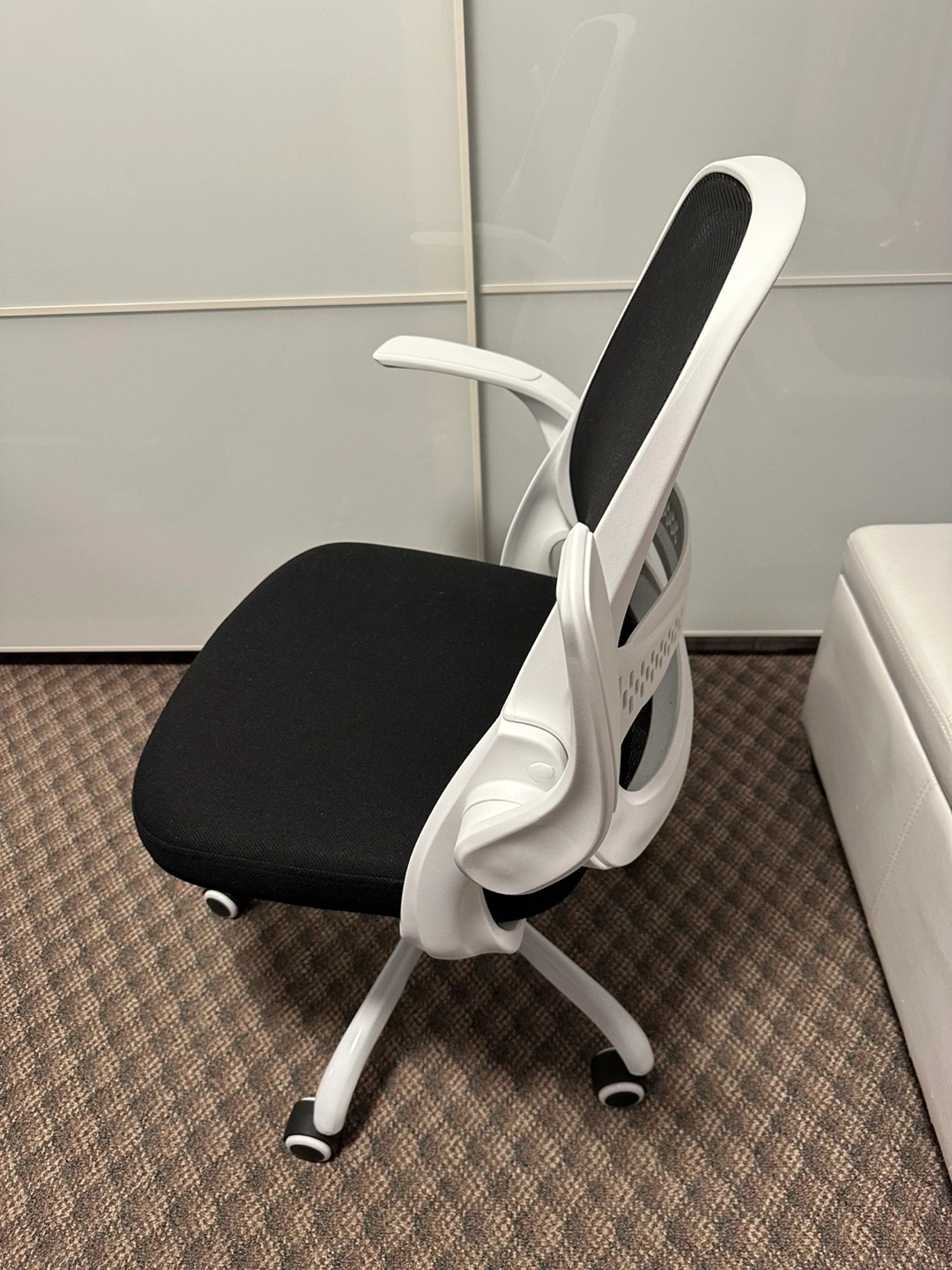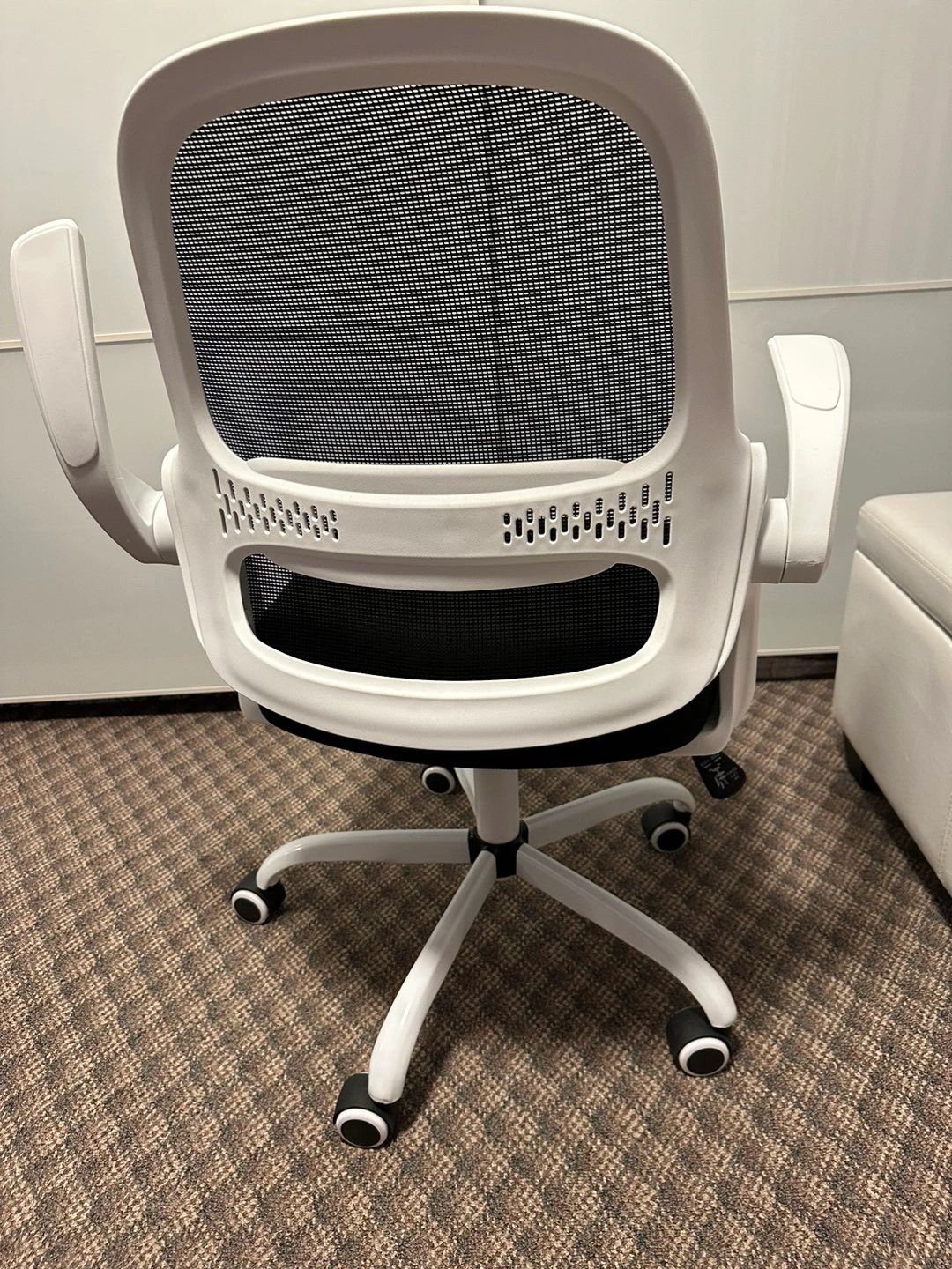 Brand new office chair - white frame, adjustable height and lift up elbow handles for easy pull in to the desk (space saving). Best for people up to 5”10 height and up to 250 lbs.
