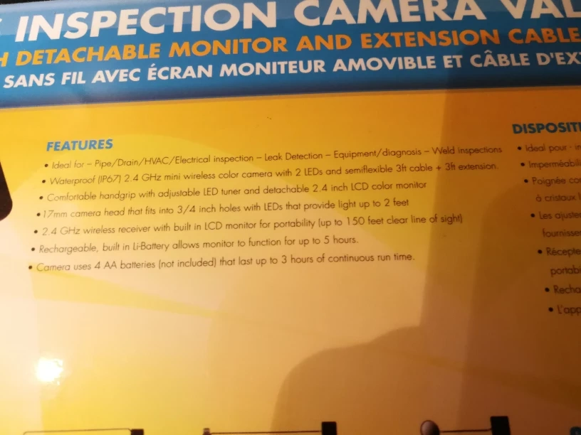 Wireless inspection camera, portable device used to view inaccessible areas. Includes detachable monitor and extension cable.