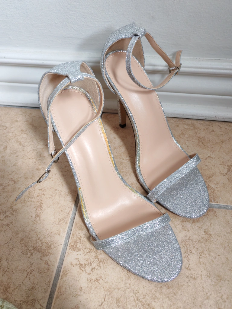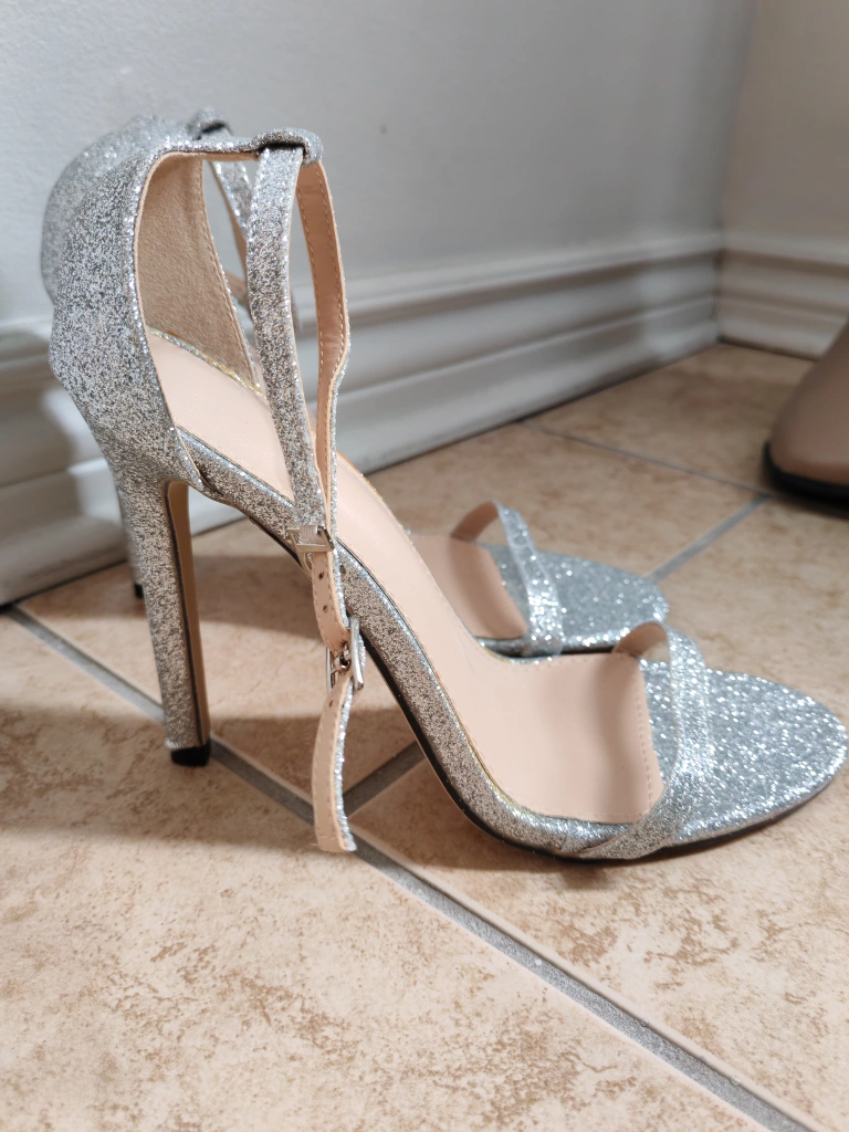 Silver Glitter Ankle Strap Heels Size 40