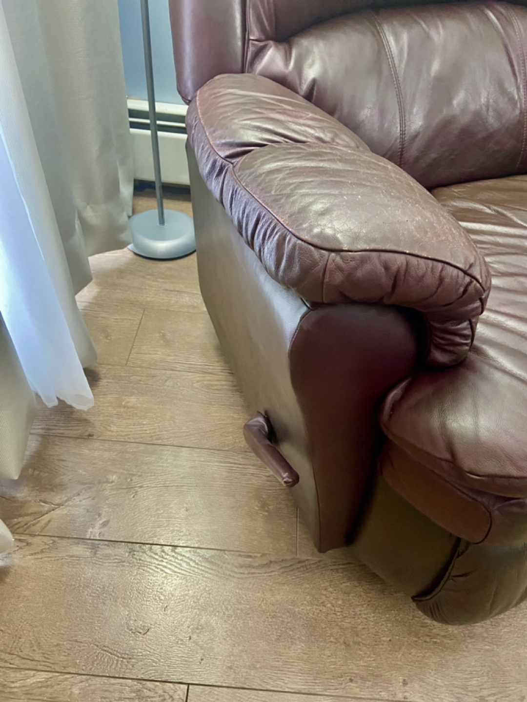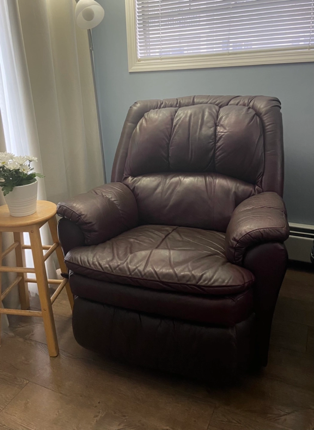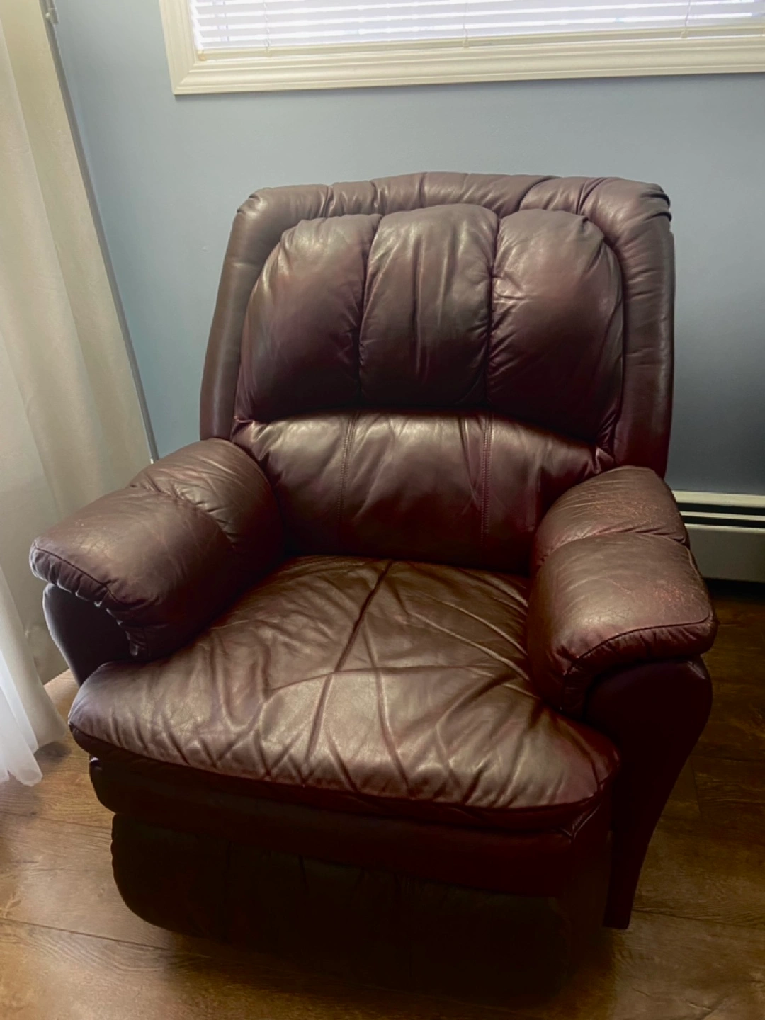 Comfortable recliner chair. Dark brown leather. Shows some wear. Reclines smoothly. Great for relaxing. Available only for pickup.
