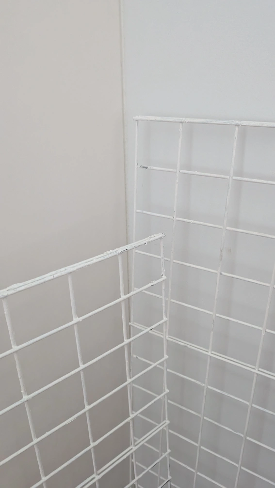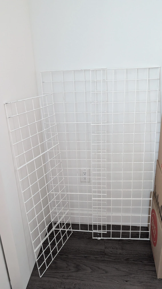 Three white metal grid panels. Great for closet organization or shelving. Some minor wear, they were black before but I painted them white so they are bit scuffed with the paint but still work great. i have 3 available