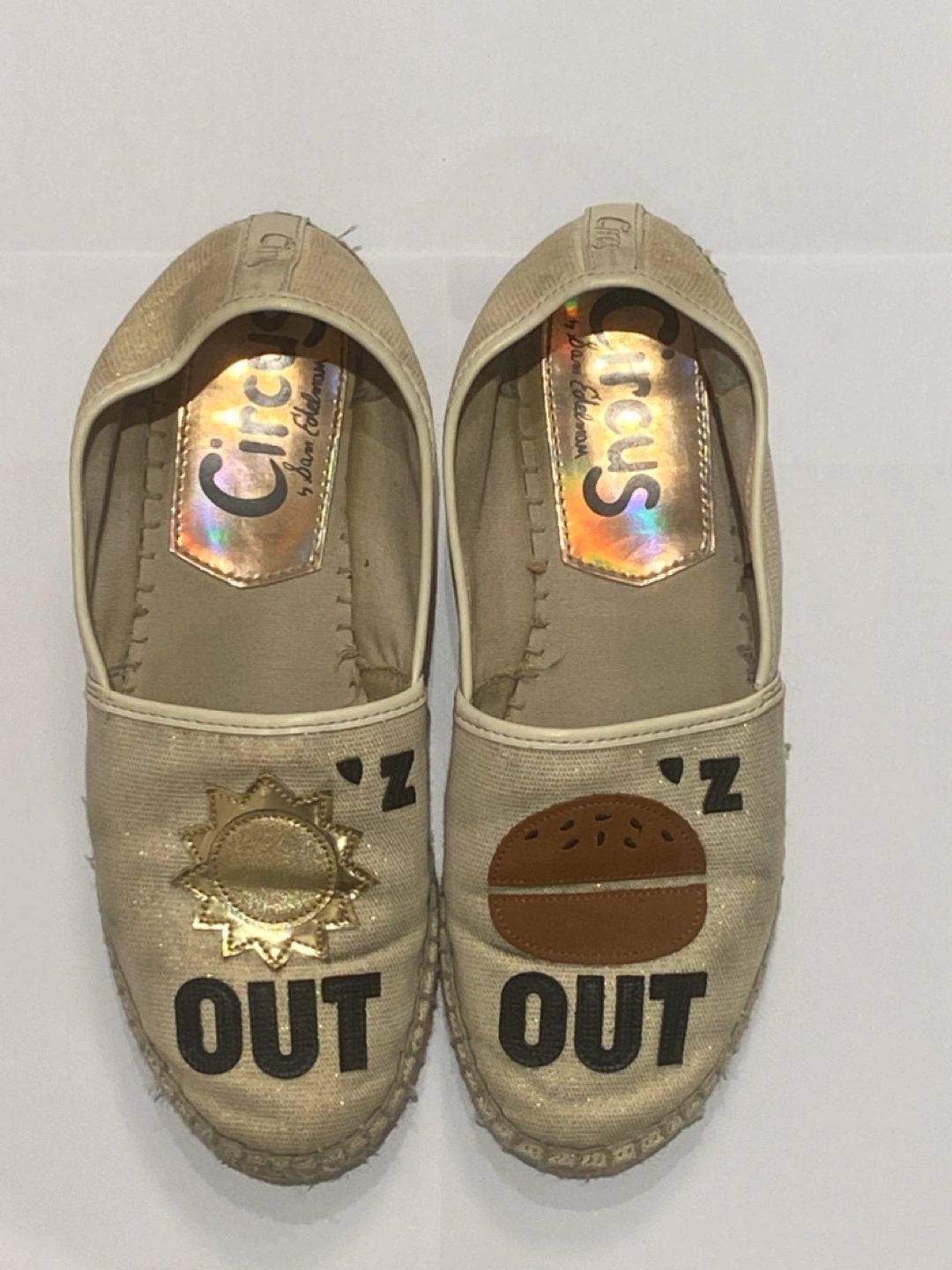 Women's espadrilles in neutral tone with gold flecks. Slip on, lightweight, and comfortable. Perfect for summer or your next beach vacation.