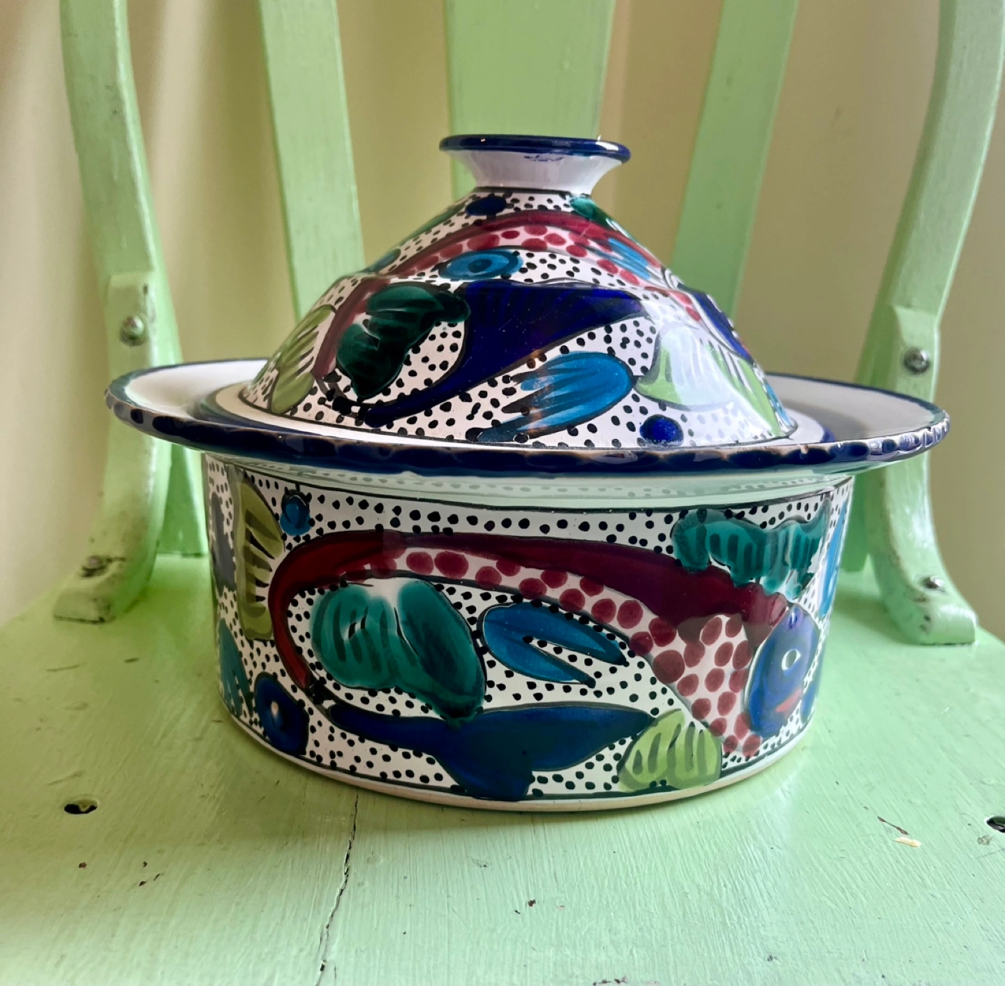 Beautiful, colourful ceramic casserole dish. Intricate hand-painted design. Perfect for serving or display. Porch pick up Montgomery, near Market Mall. Cross-posted.
