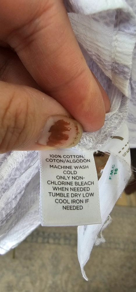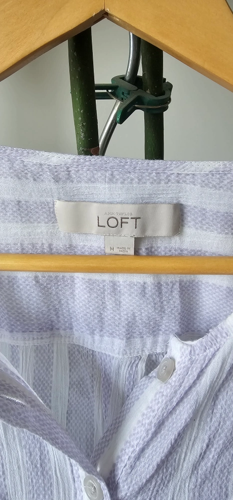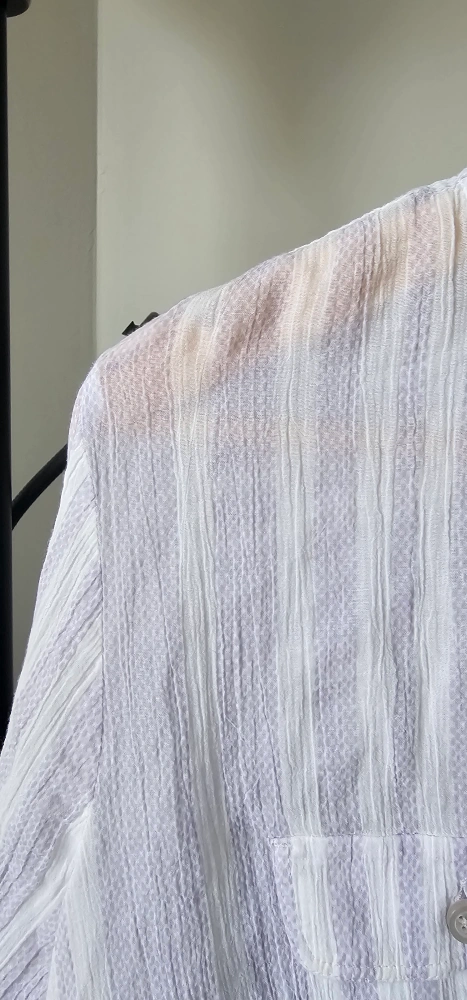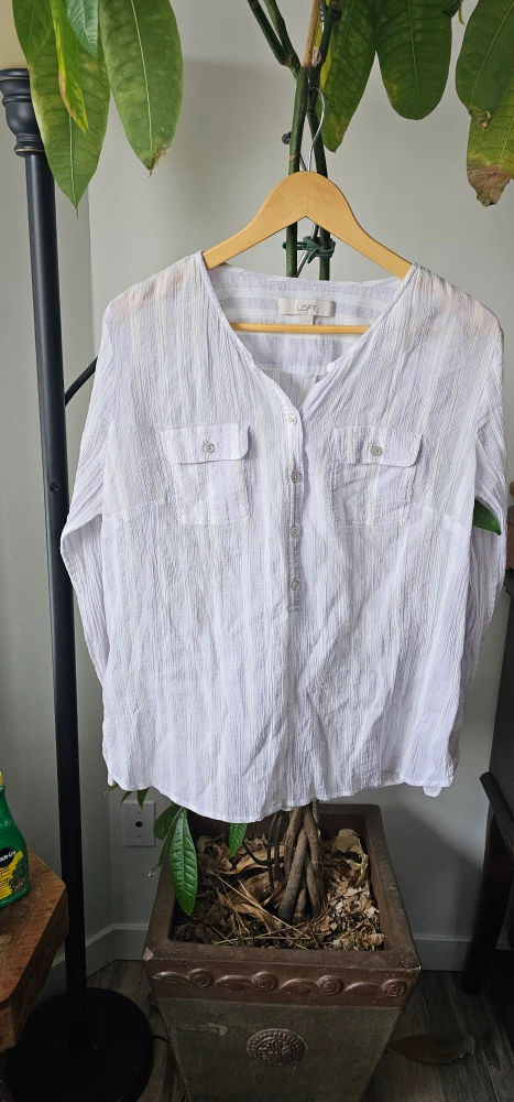 Lightweight light lavender and white long-sleeve button-down shirt. Features two chest pockets. 100% cotton. Machine wash cold.