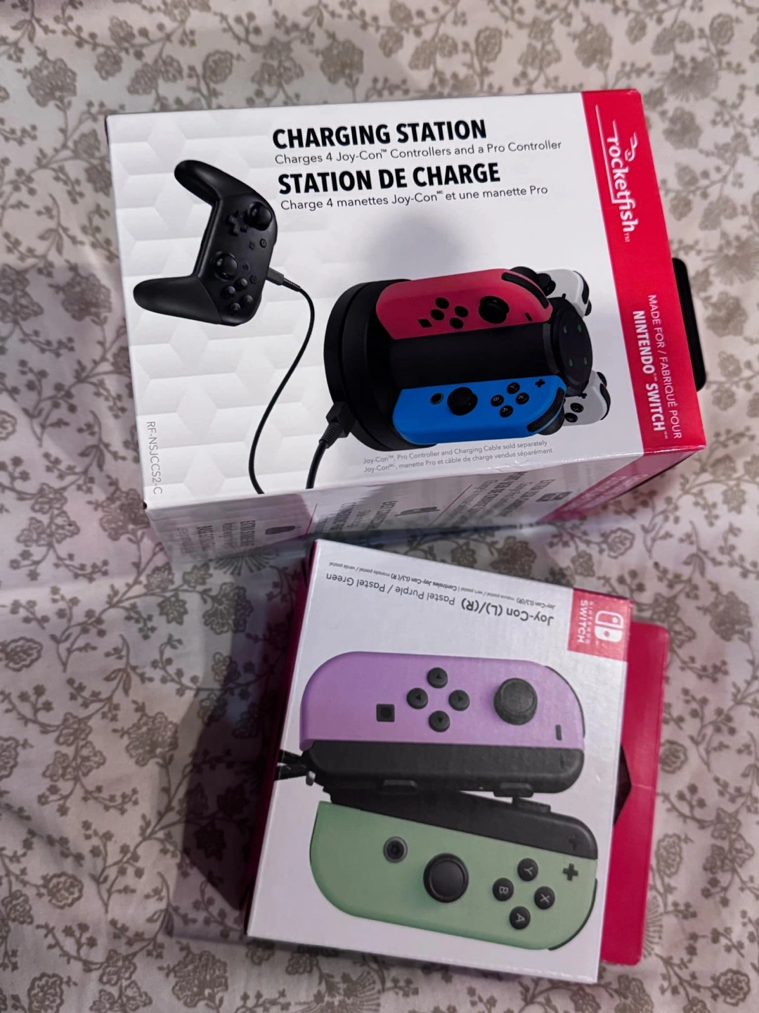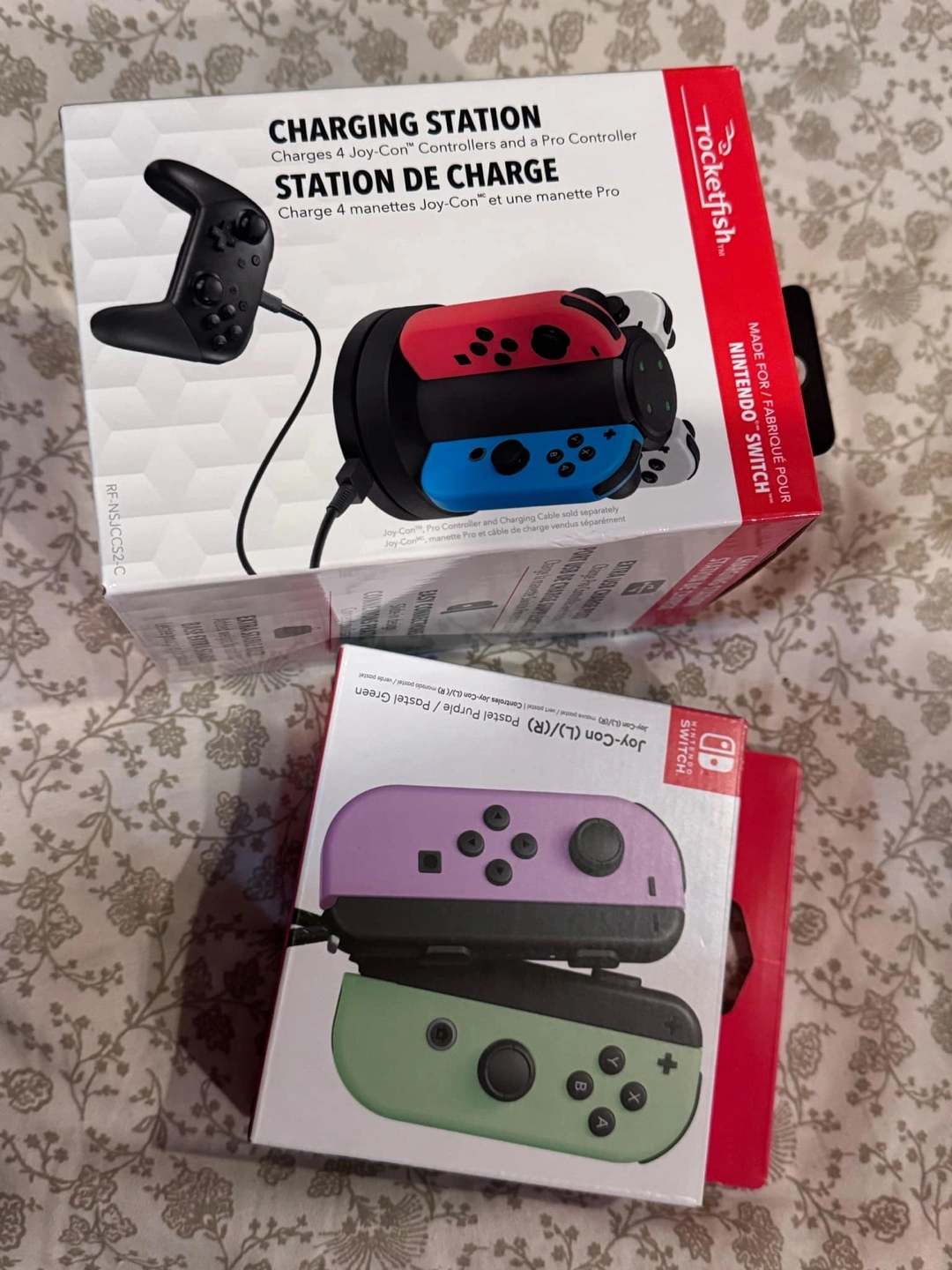 Rocketfish charging station. Charges four Joy-Cons and one Pro controller. Includes a pair of pastel purple/green Joy-Cons. New, unopened.