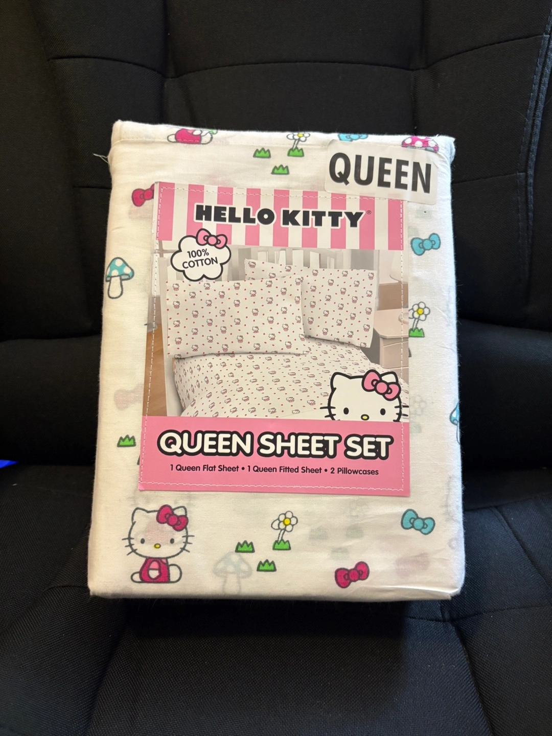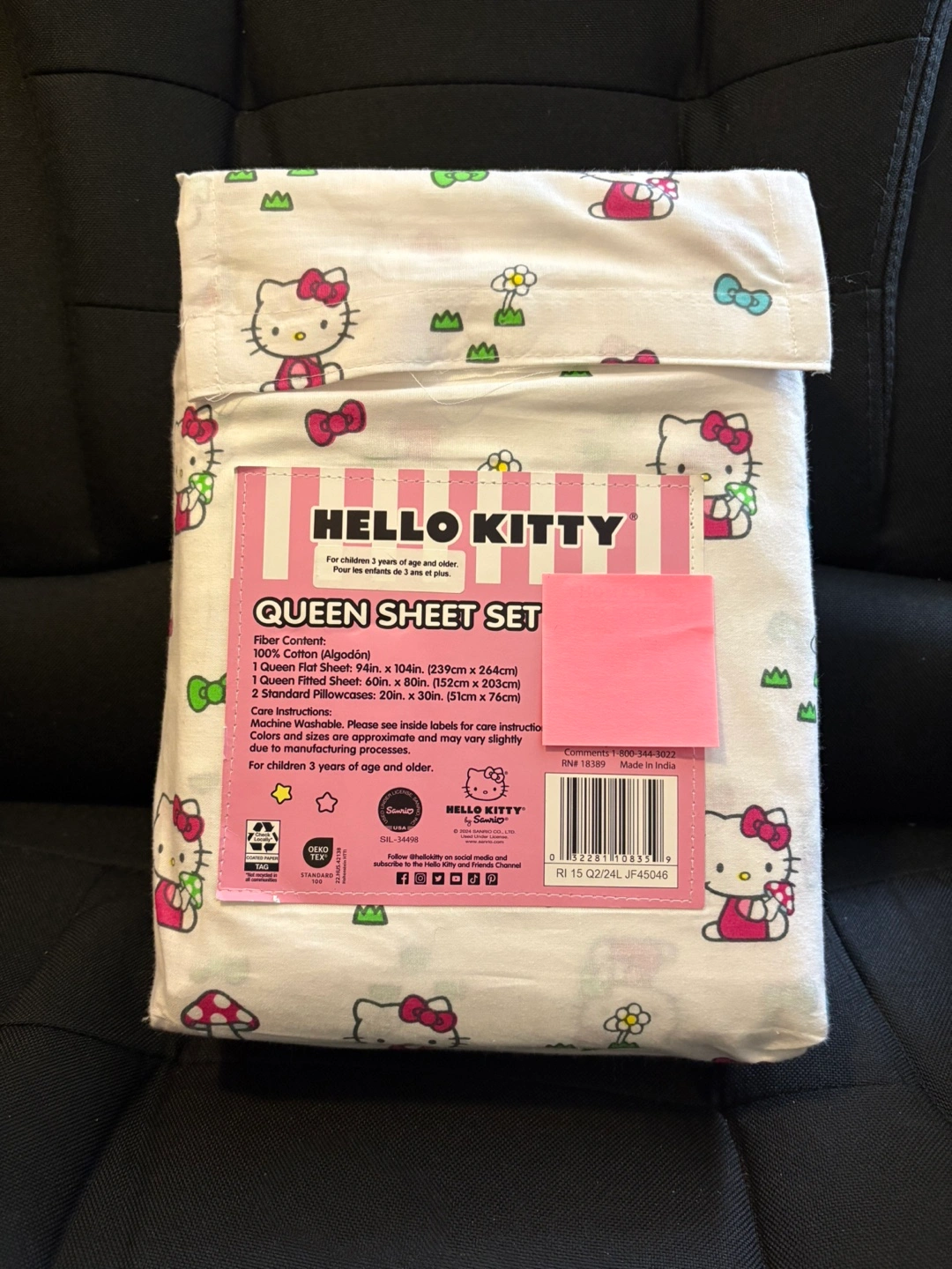 New Hello Kitty queen sheet set. 100% cotton. Includes one flat sheet, one fitted sheet and two pillowcases. Adorable design featuring Hello Kitty and friends.