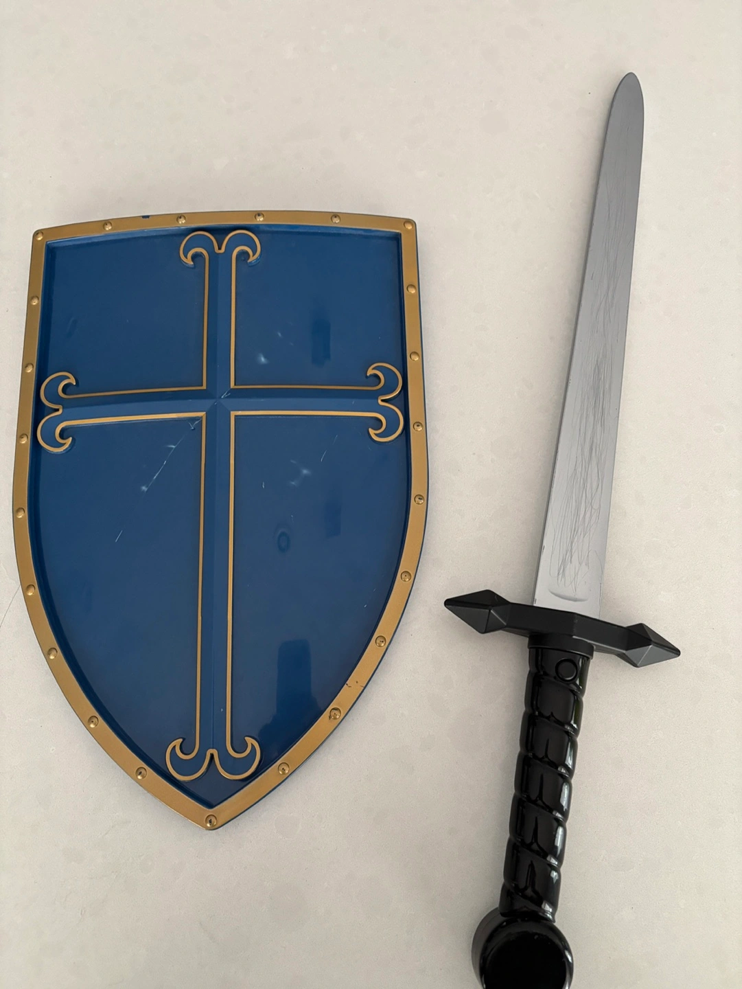 Suit up your young knight with this blue Crusader sword and shield set! While it has been used in countless imaginary battles, this set remains in good condition and is ready for more adventures. It features a blue shield adorned with a gold cross and trim, paired with a black handled silver sword.