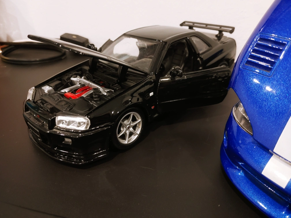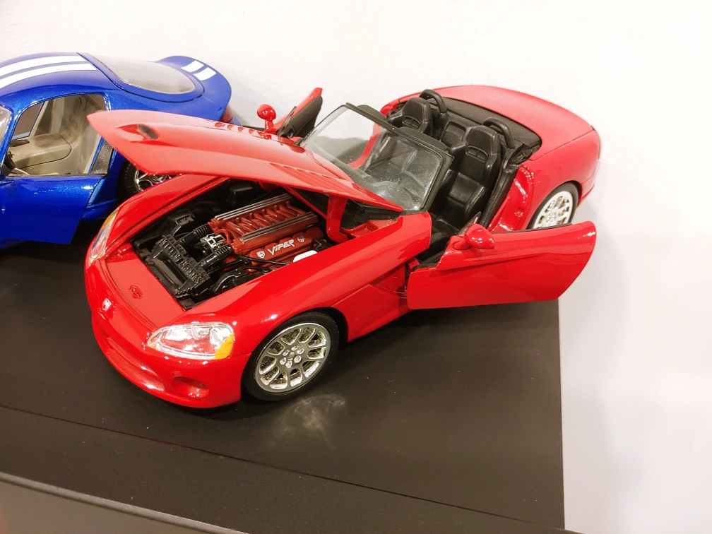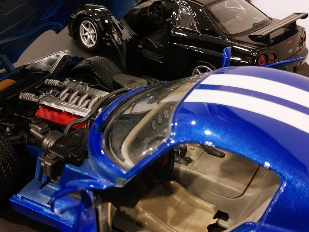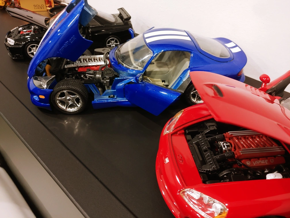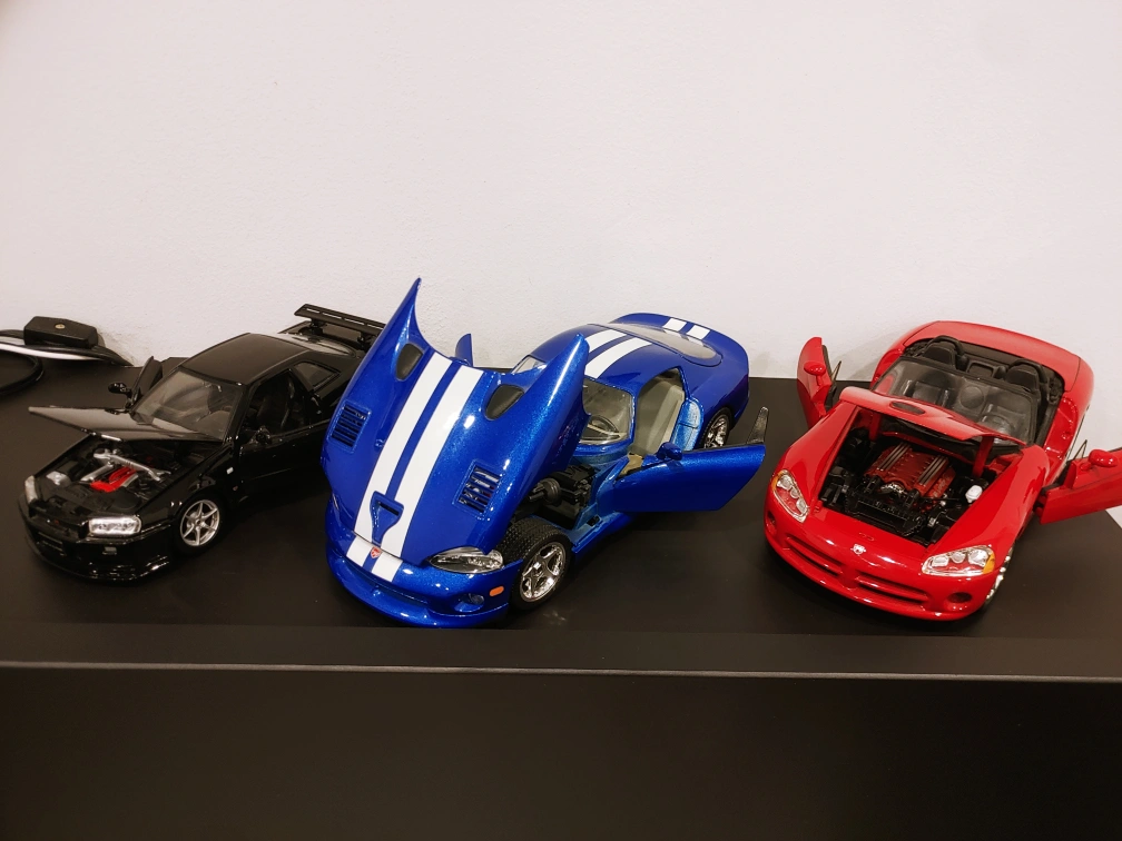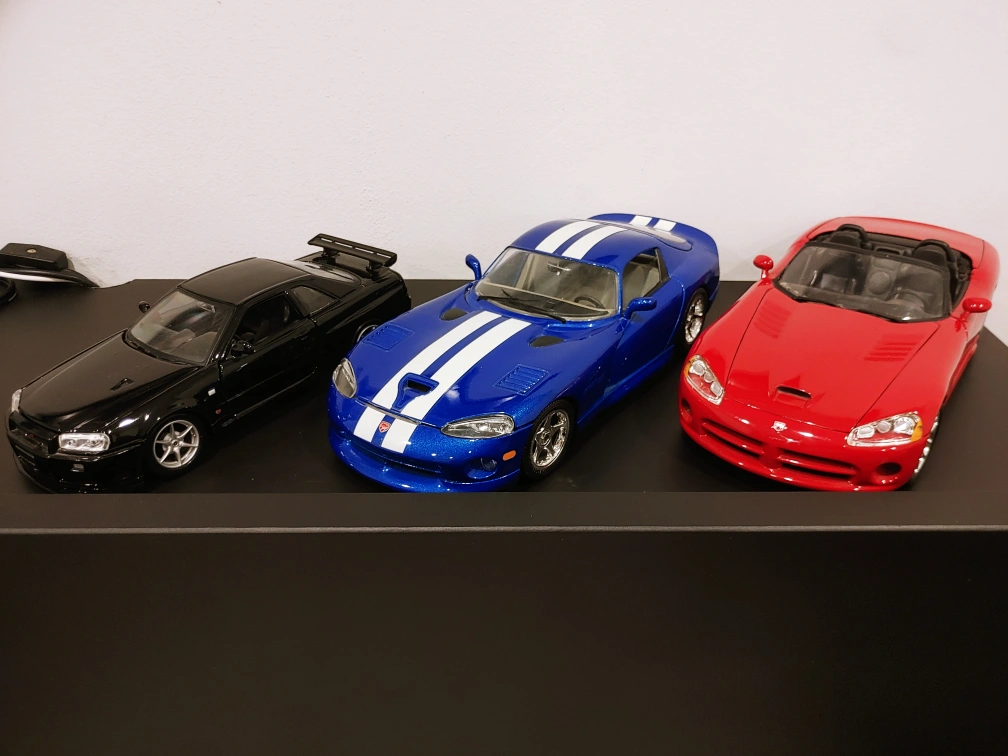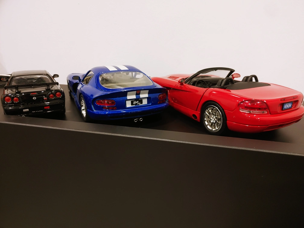 Three detailed model cars. Two Dodge Vipers, one blue and one red. One black Nissan Skyline R34 GT-R. Engine compartments open. Great for collectors.
