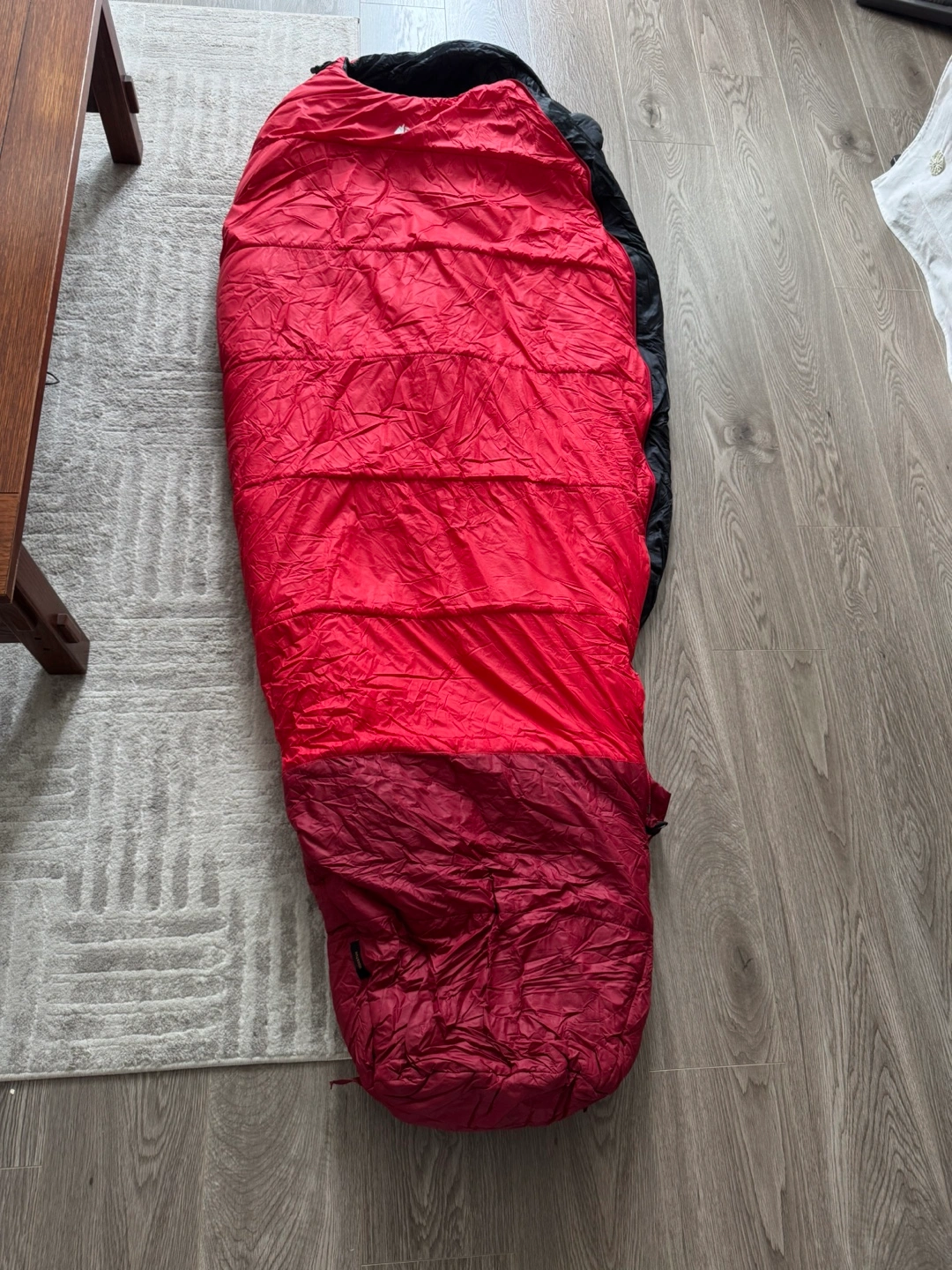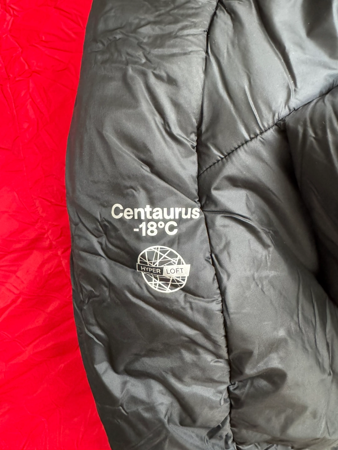 Red and black sleeping bag. Quantum Hyper Loft filling. -18°C comfort rating. Comes with stuff sack.
