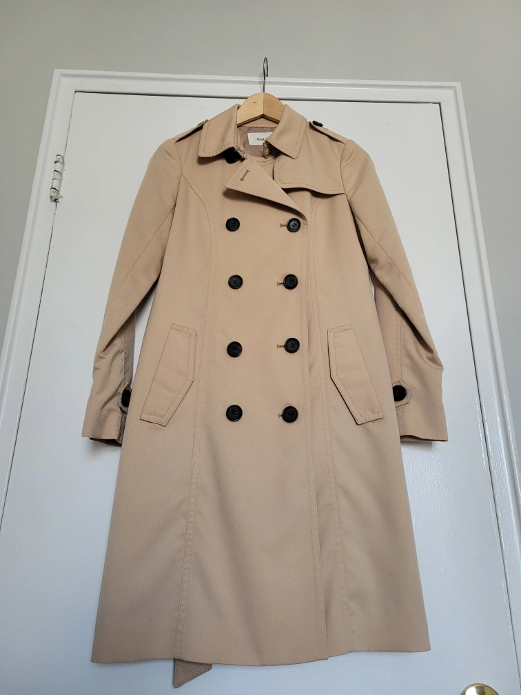 281I bought this in Japan and normally wear size XS in Canada. This is from Japanese brand "Royal Party" and was about $120. Classic beige trench coat. Double-breasted, belted. Features a collared neckline and long sleeves. Pockets included. Made of polyester, rayon, and polyurethane. Polyester lining.
