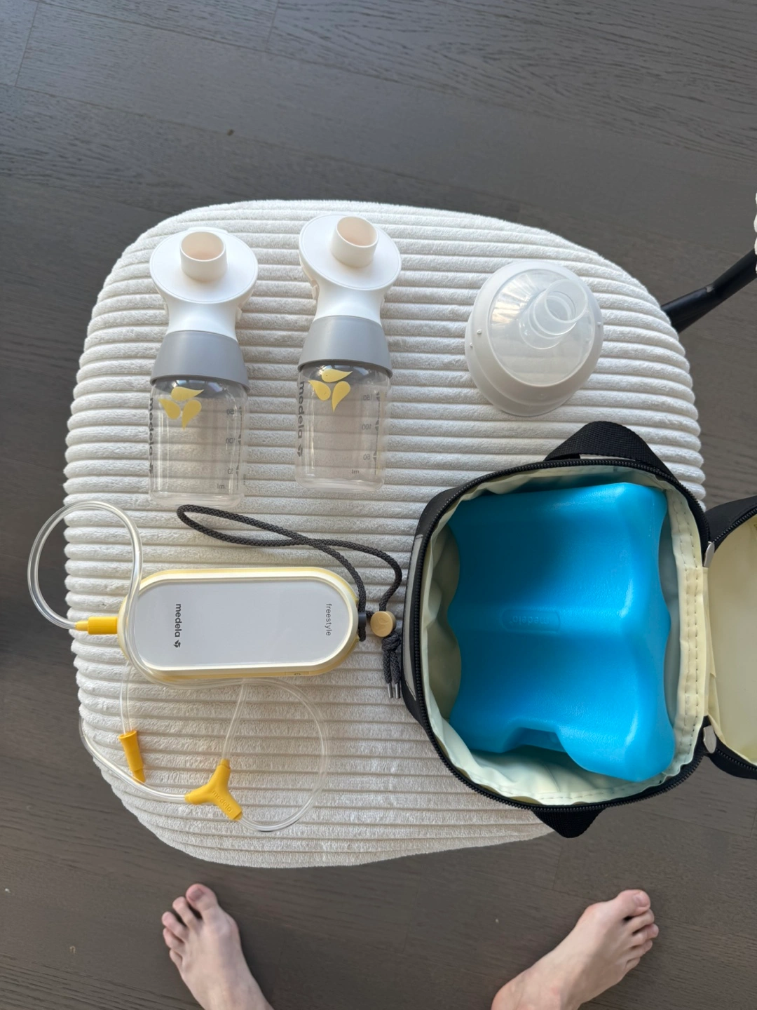 Double electric breast pump, includes two bottles, extra parts, and a cooling bag. Portable and convenient. Used, good condition.