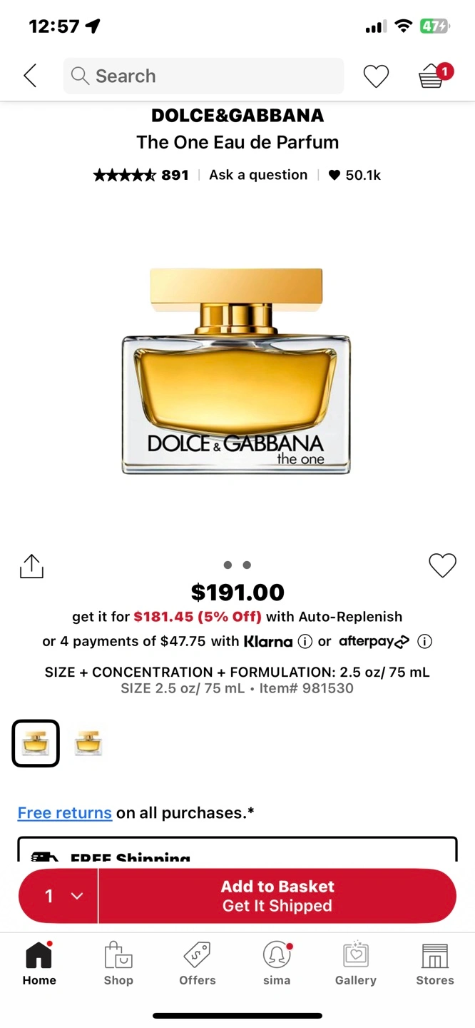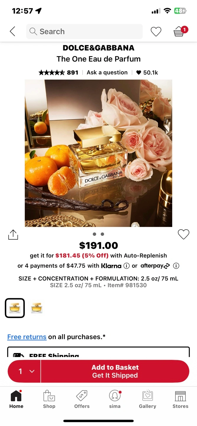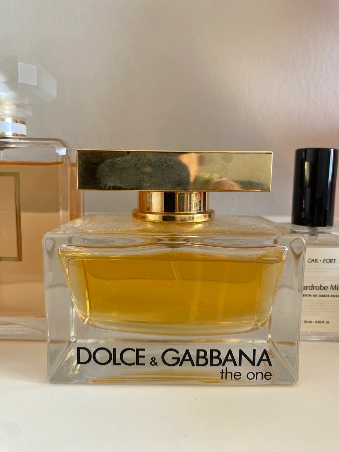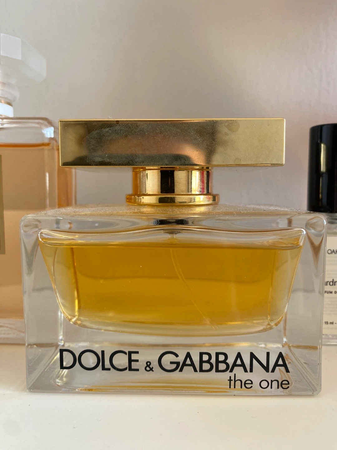 1000+Dolce & Gabbana The One Eau de Parfum. 2.5 oz / 75 ml. Gold accents. Fragrance Family: Warm & Spicy Scent Type: Warm and Sweet Gourmand Key Notes: Amber, Jasmine, Peach, Vanilla Fragrance Description: Sensuous and timeless, The One Eau de Parfum is the essence of the DOLCE&GABBANA woman. This floral fragrance combines contemporary fruit ingredients with the perfumer's classic palette of white flowers. The scent opens with sparkling bergamot and mandarin blended with notes of lychee and peach. Heart notes of Madonna lily express a voluptuous intensity and enveloping femininity followed by the seductive dry-down of vanilla, amber, and musk. Note- Used but still full π