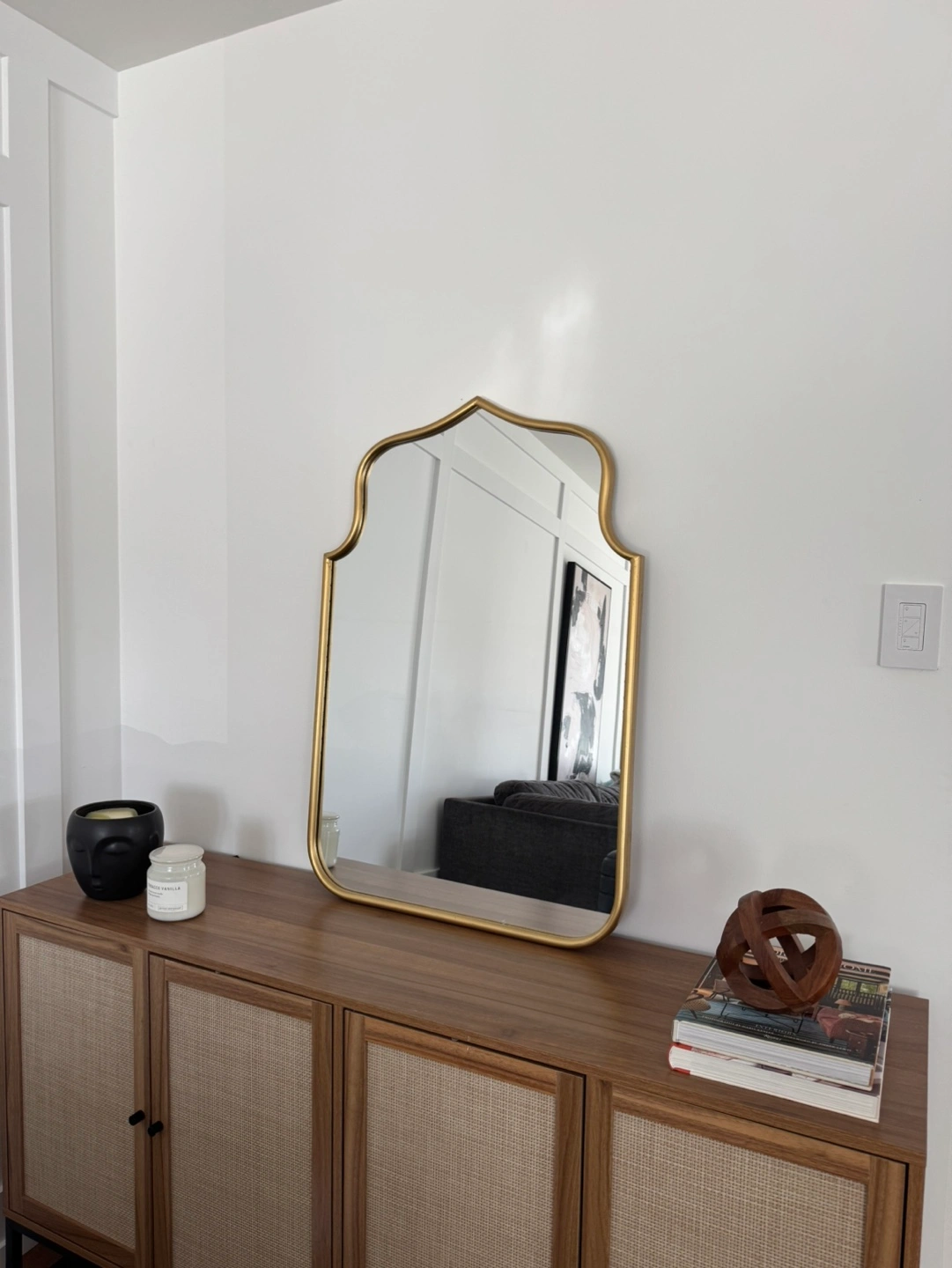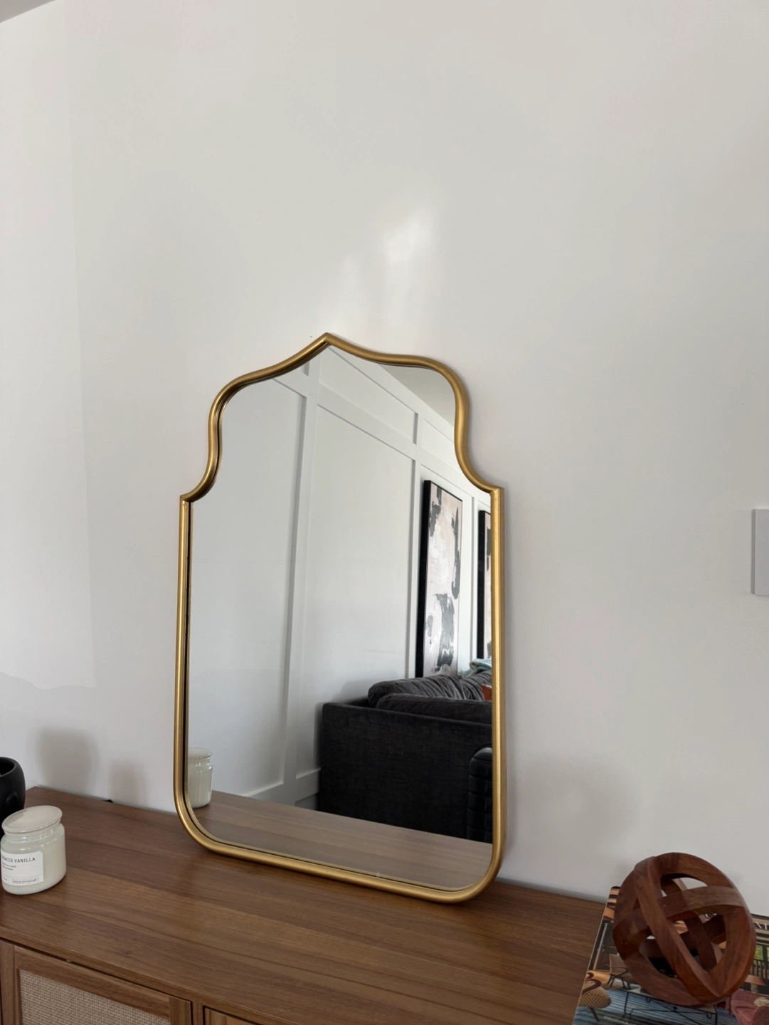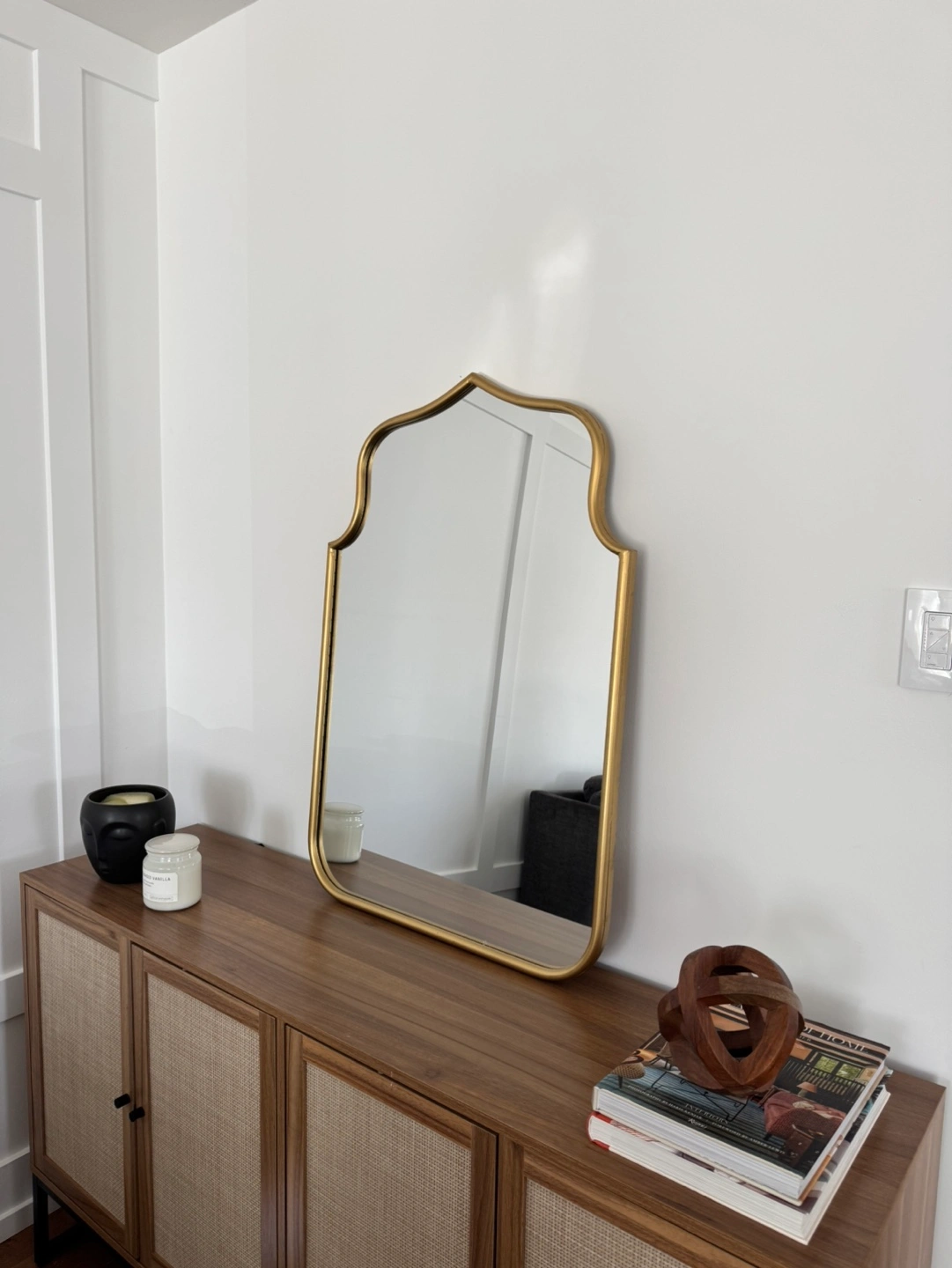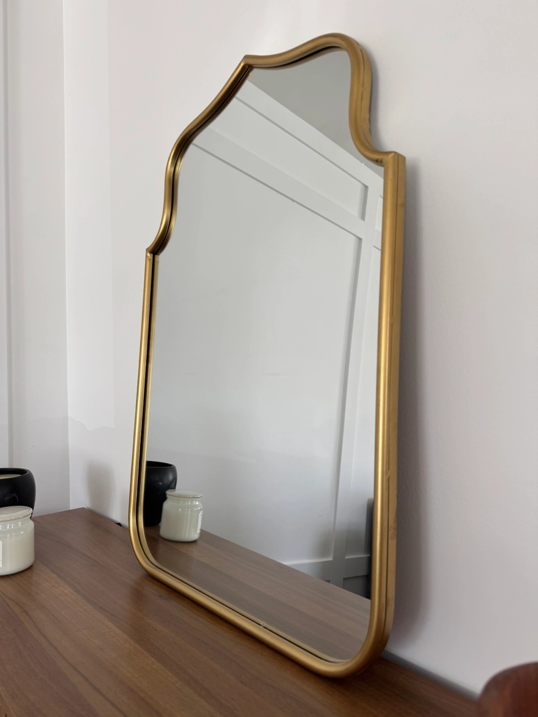 Elevate your space with this unique arched gold mirror. Perfect for entryways, bedrooms, or above a console table.