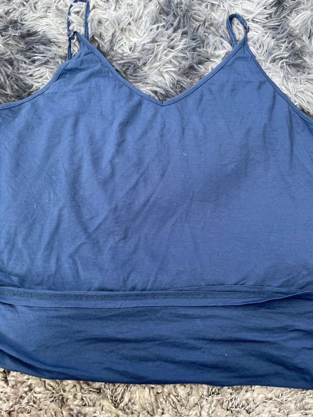 Loose style Simple navy blue tank top. Features a V-neck and thin straps. Relaxed fit.
