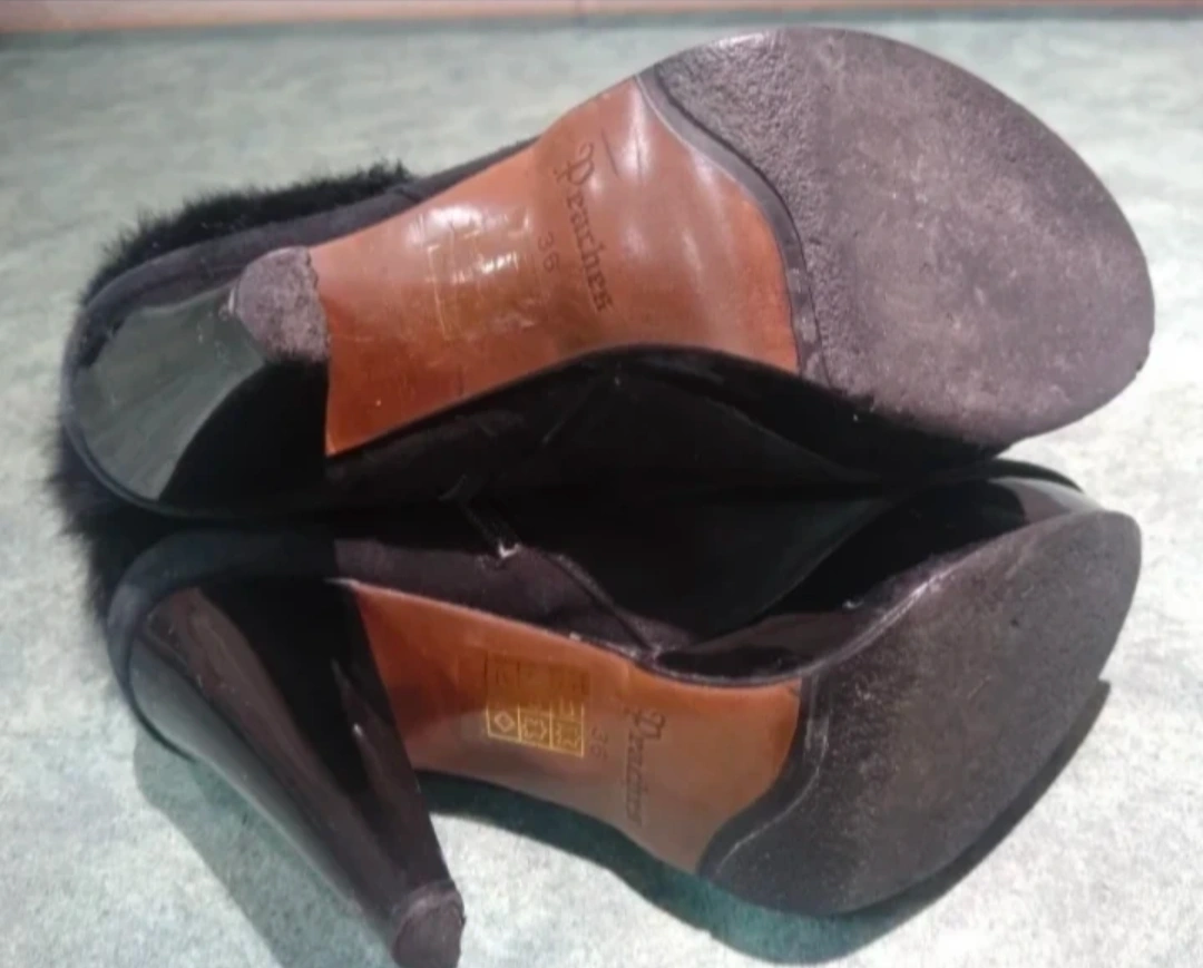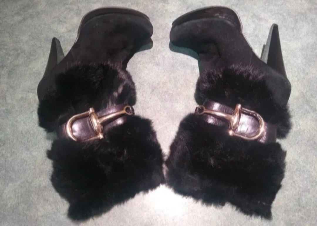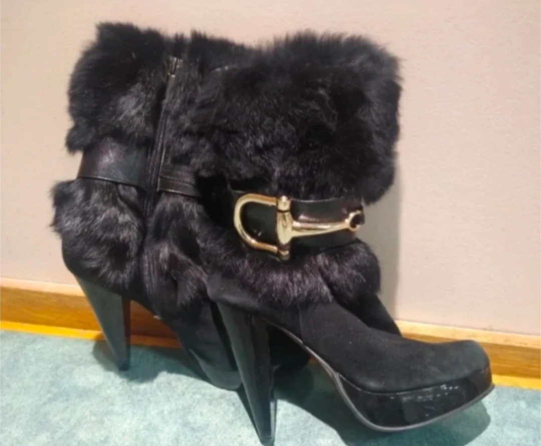 Ladies zip-up black suede and faux fur high heeled boots with gold buckle accent. Brand name Peaches. Size 6.