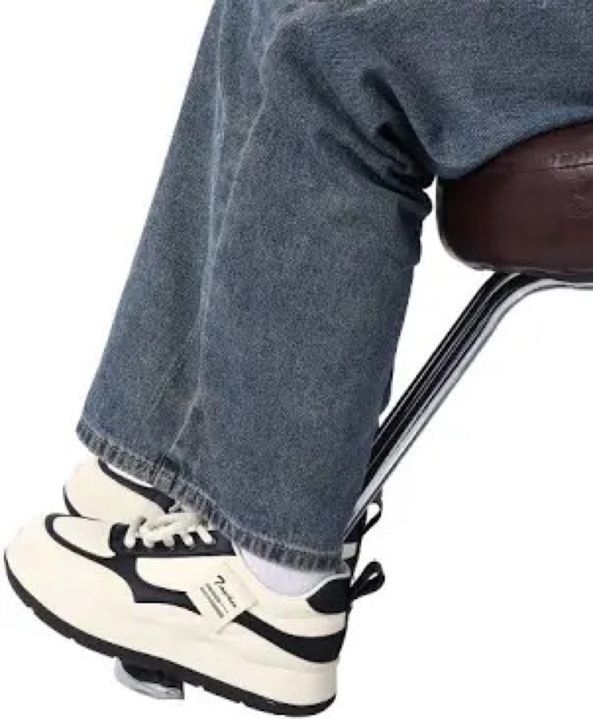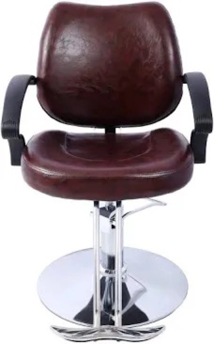 Well-maintained barber chair. Features a brown leatherette seat and backrest, chrome-plated base, and hydraulic lift. Adjustable height. Includes footrest. Colour black