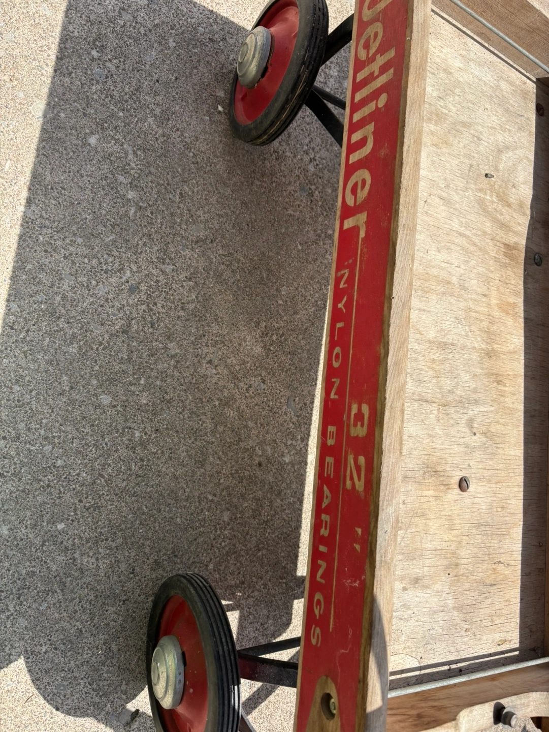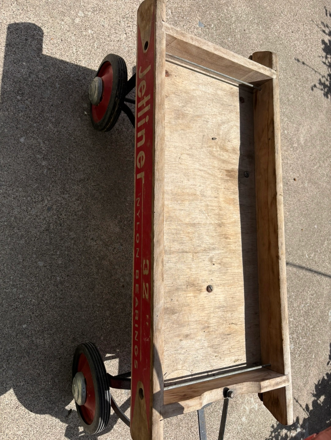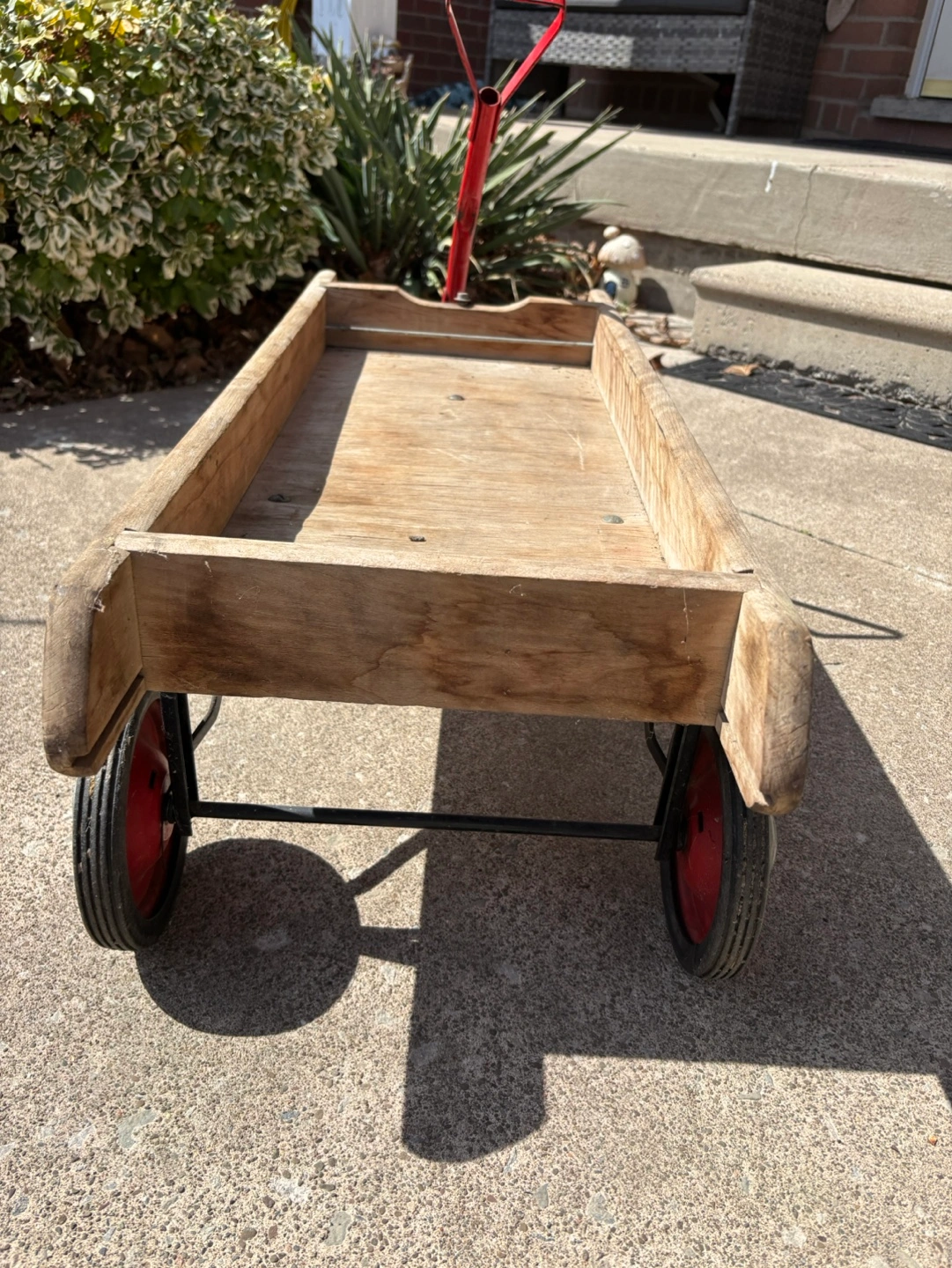 Vintage Wooden wagon. Red metal frame and handle. Nylon bearings. Four wheels. Shows wear from age and use.
