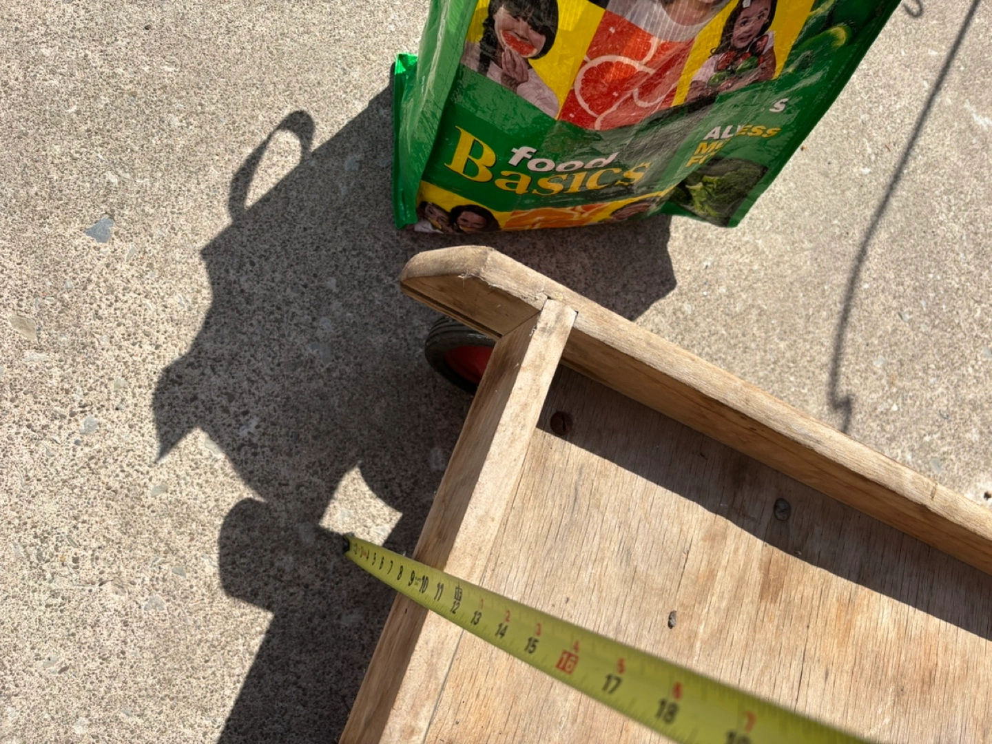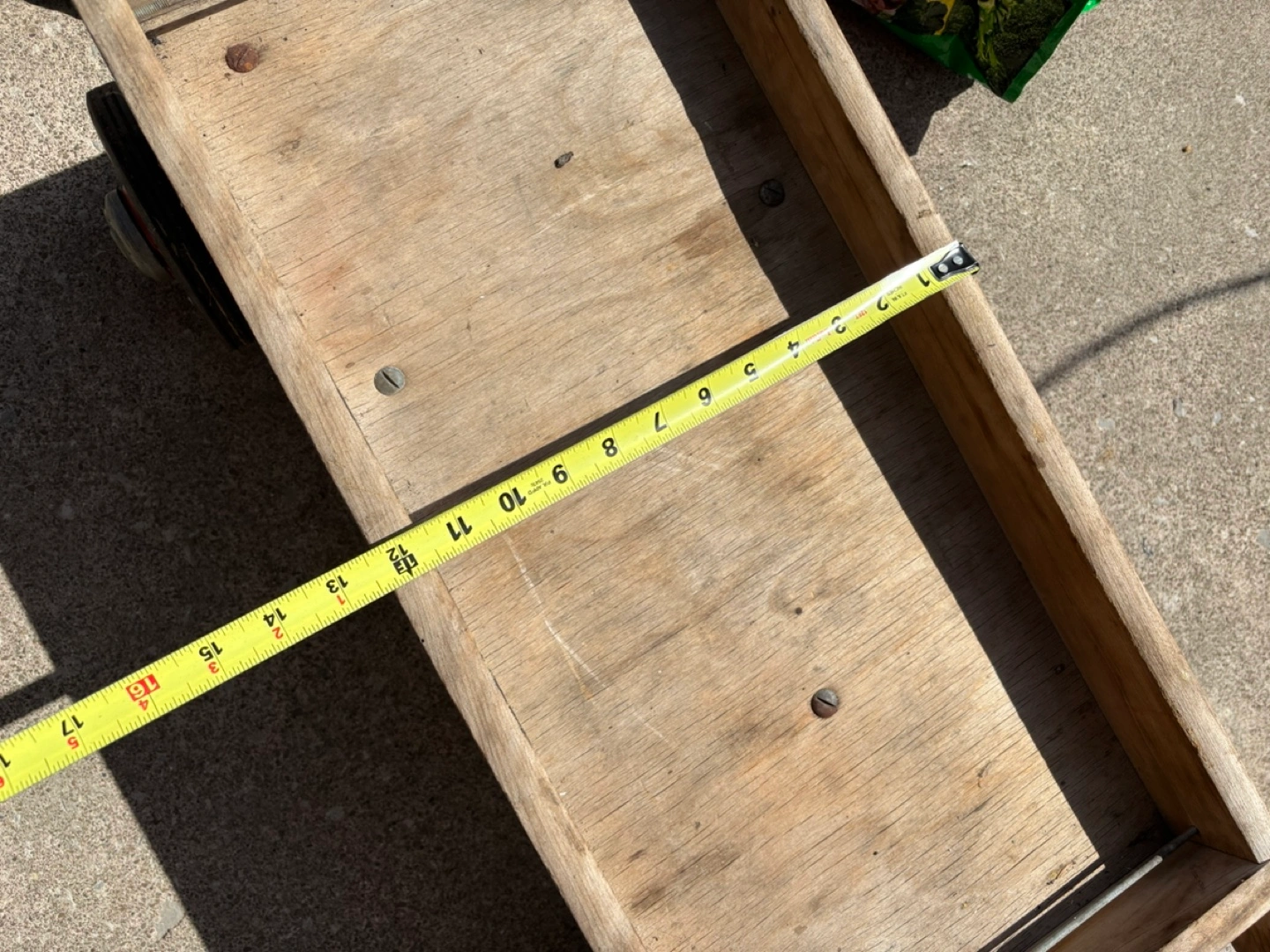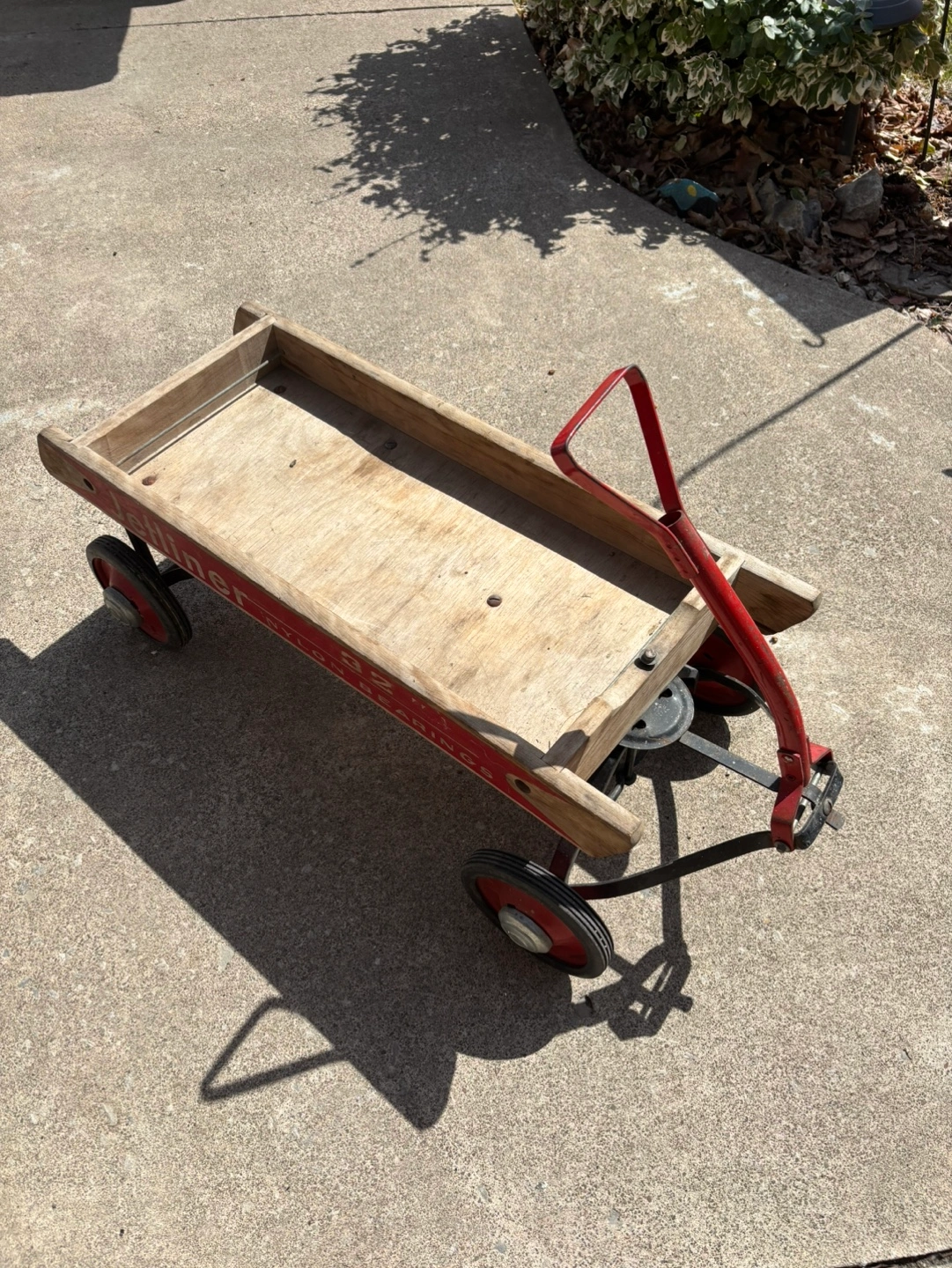 Vintage Wooden wagon. Red metal frame and handle. Nylon bearings. Four wheels. Shows wear from age and use.