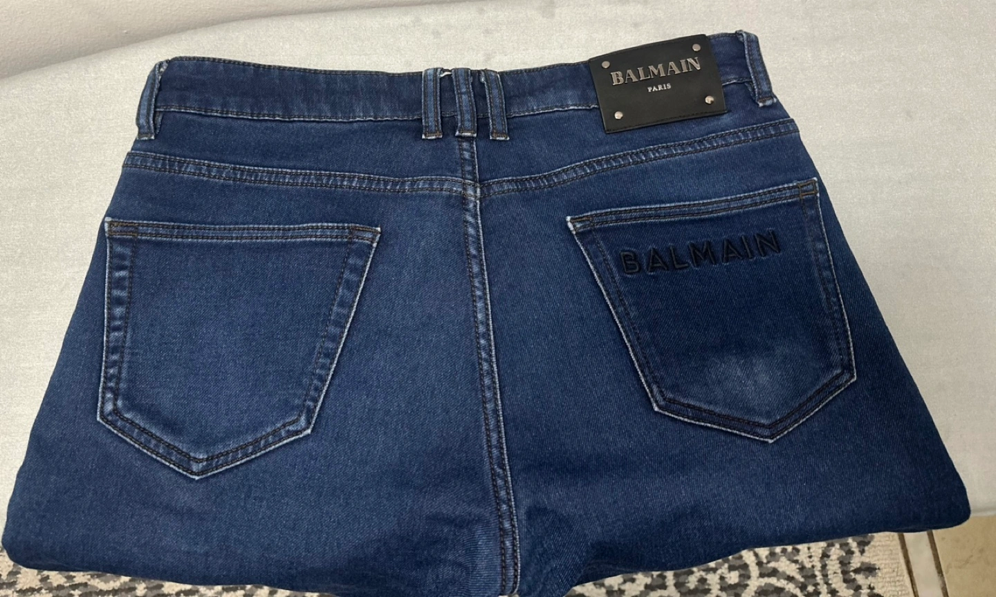 Dark wash Balmain jeans. Men's size 32. 98% cotton, 2% elastane. Regular fit. Embroidered logo on back pocket. Leather patch with Balmain Paris branding.